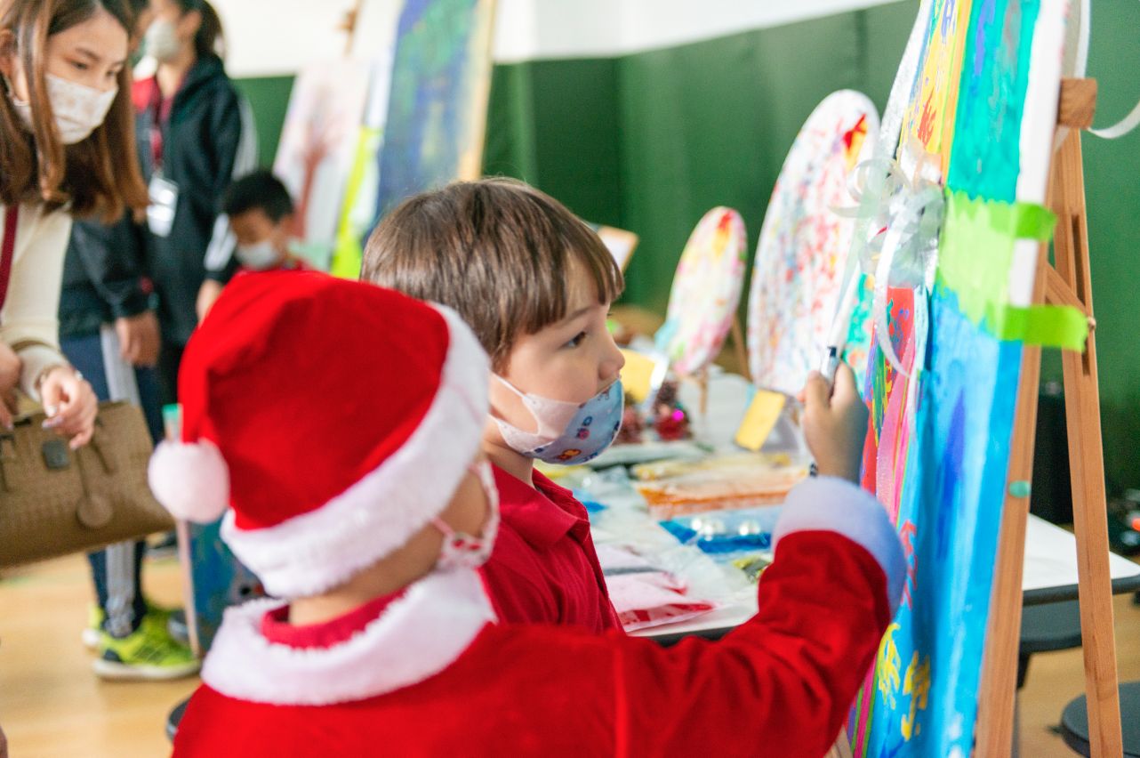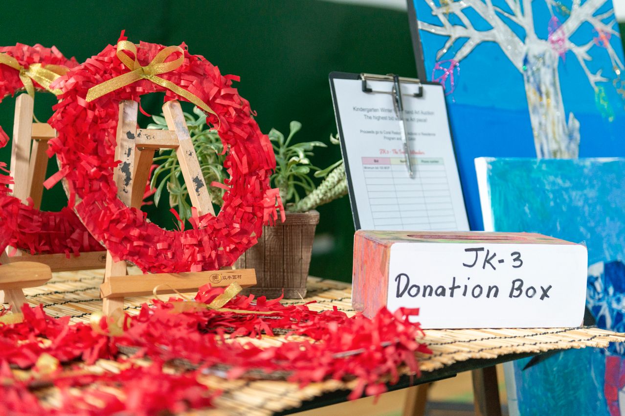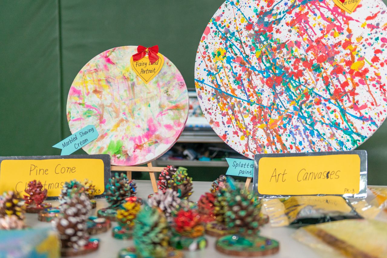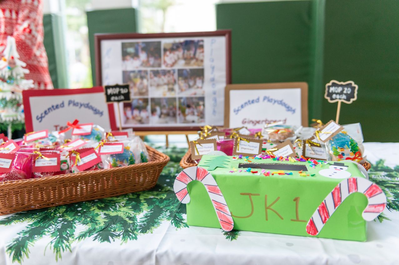 Unique Christmas gifts made by our kindergarten students, included Christmas tree decorations, gift wrapping paper and greeting card. There were all sorts of other seasonal goodies catching the eyes of our parents as they made their rounds at each table. Each class also had a big, colourful canvas that was up to be auctioned off, painted by the tiny hands of our Kindy students with the help of their high school peers.
