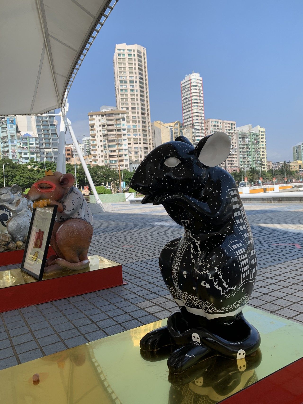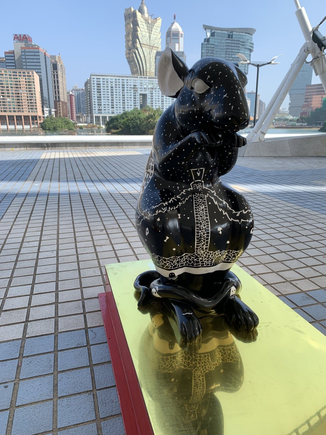 The name of Stella's sculpture, Stadståttan which means City Rat in Swedish is a tribute to her Swedish roots and her life in Macau. Using her unique black and white graphic style, you can catch glimpses of Macau with the Macau Tower and the skyscrapers. Stella loves incorporating her own original characters into her works. Her signature detailed hand-drawn art often have elaborate background stories. For this particular piece, skulls and little sewer creatures were painted onto the rat to represent the unknown. Due to the shiny material used on the sculpture’s base, the sewer creatures are reflected thus giving the piece another dimension.