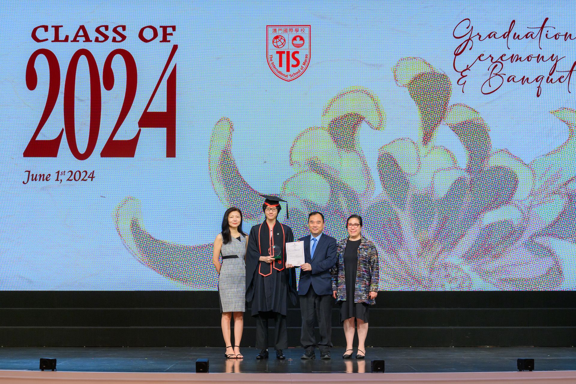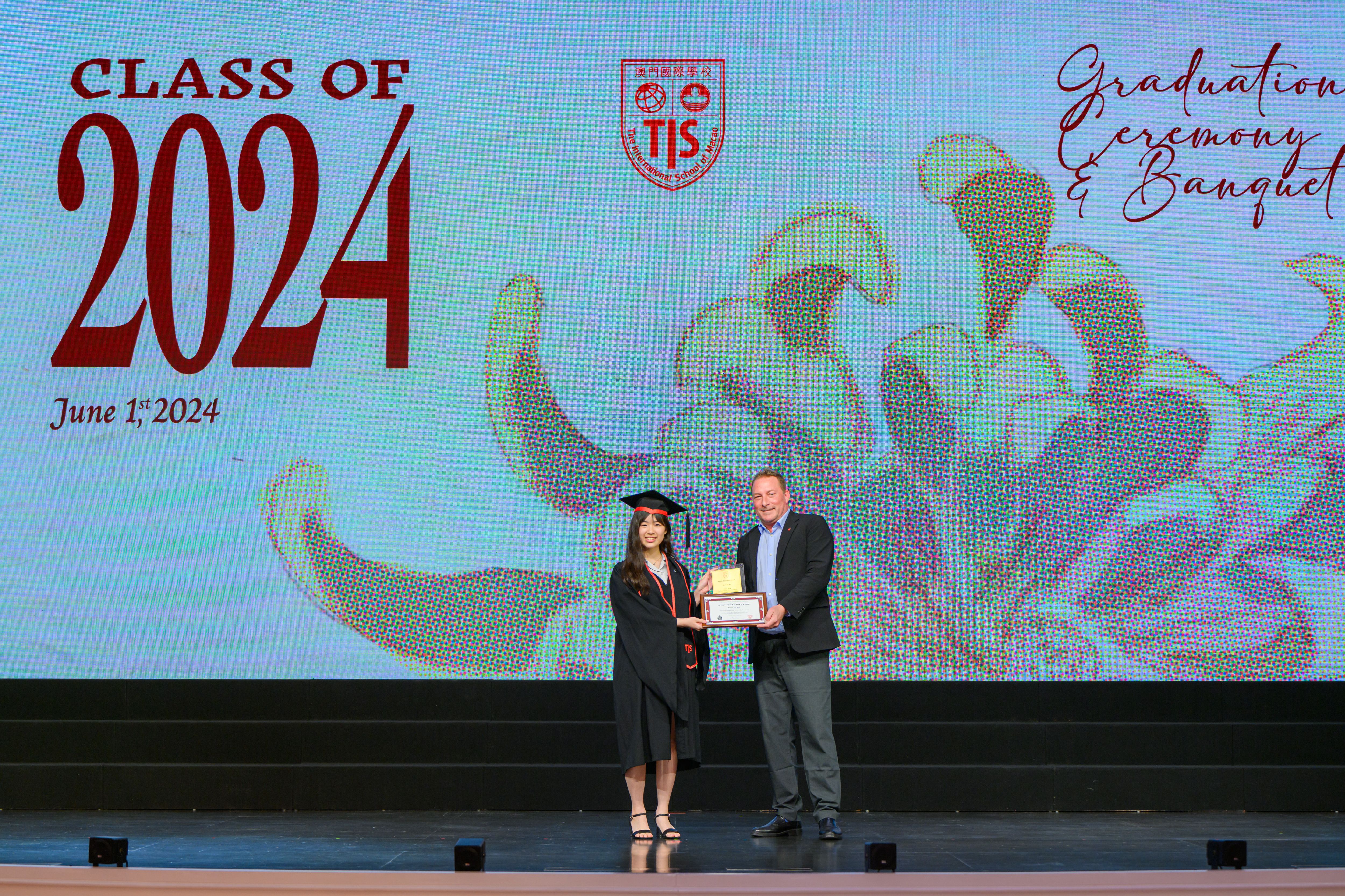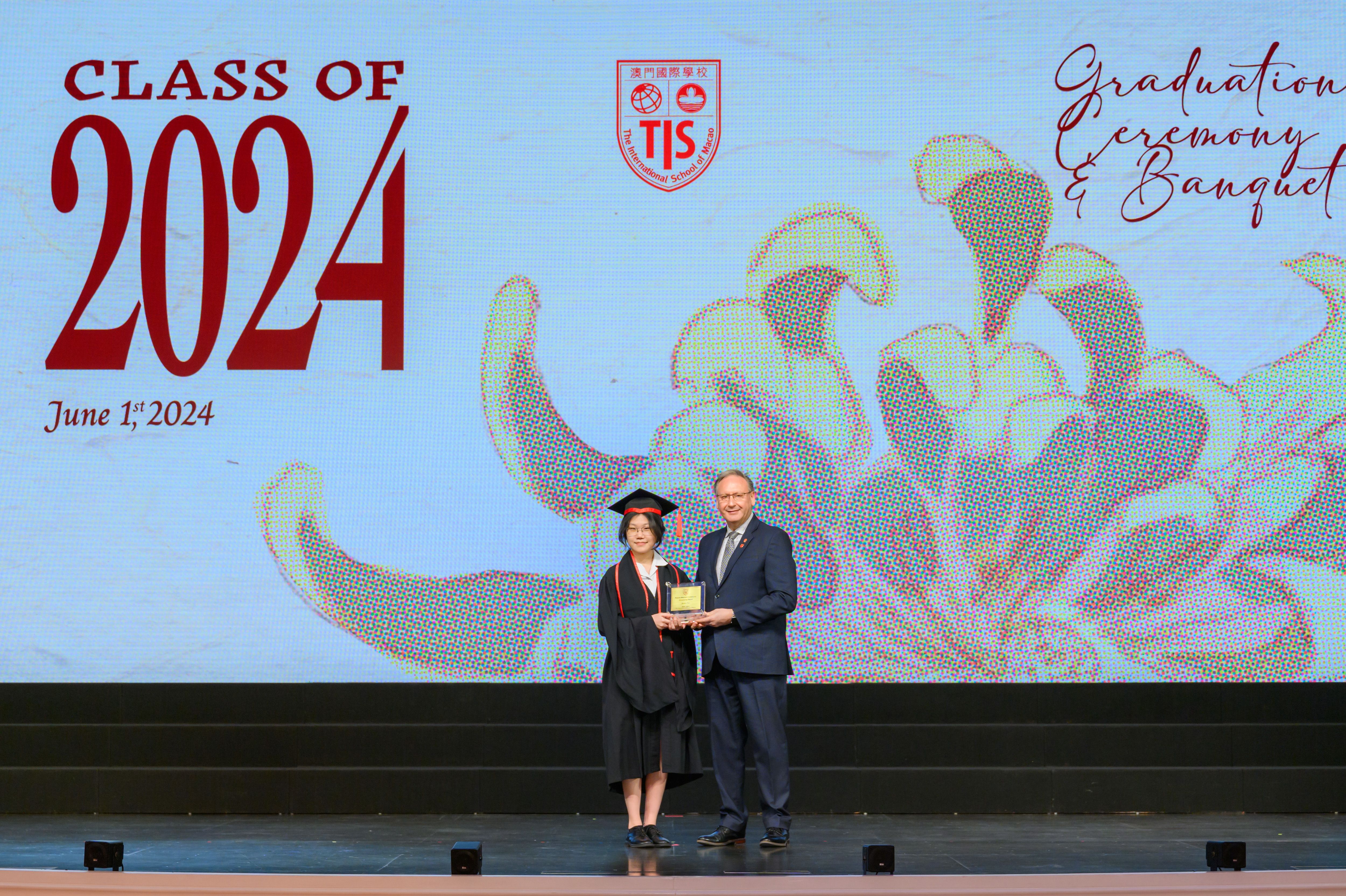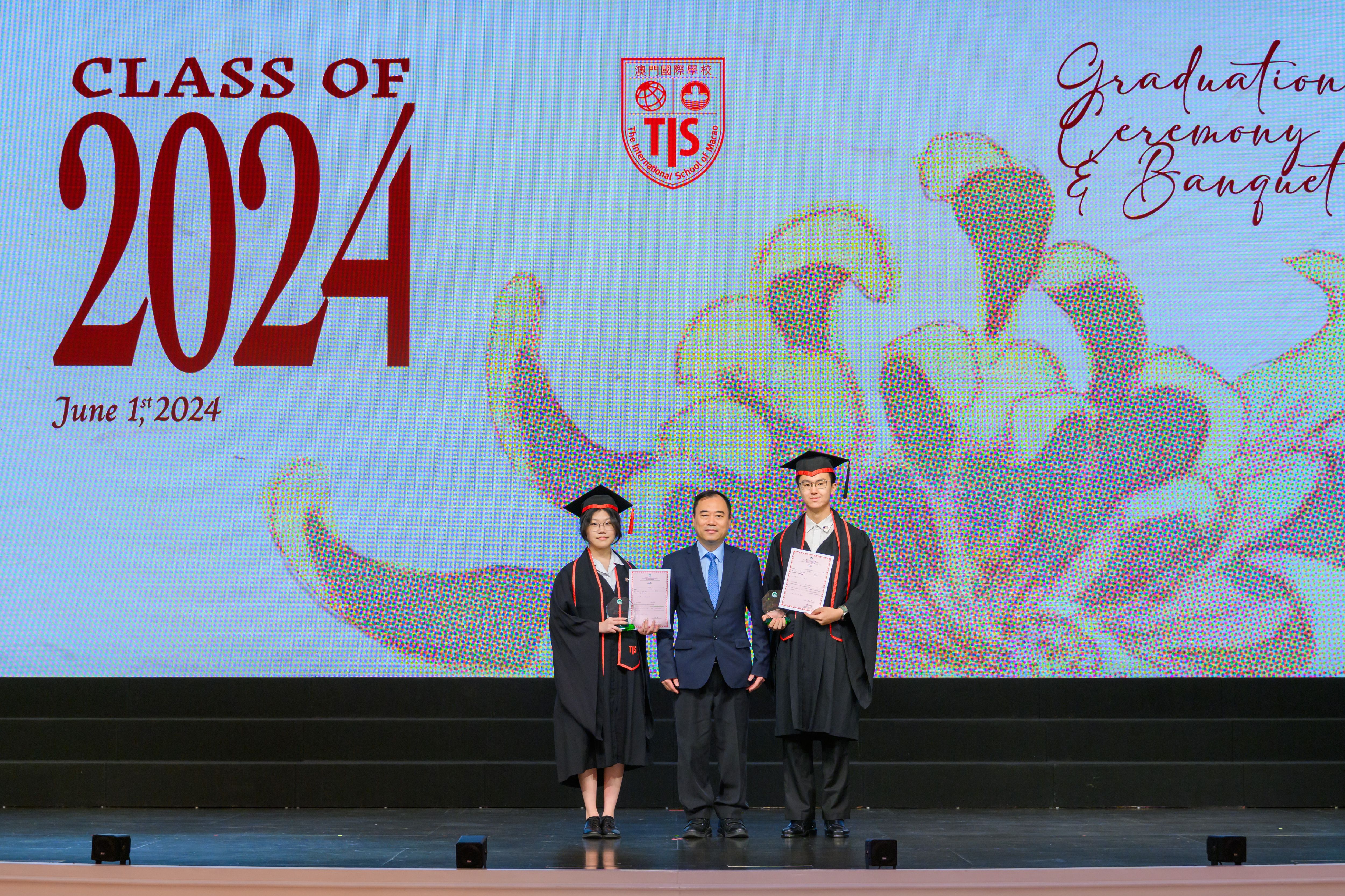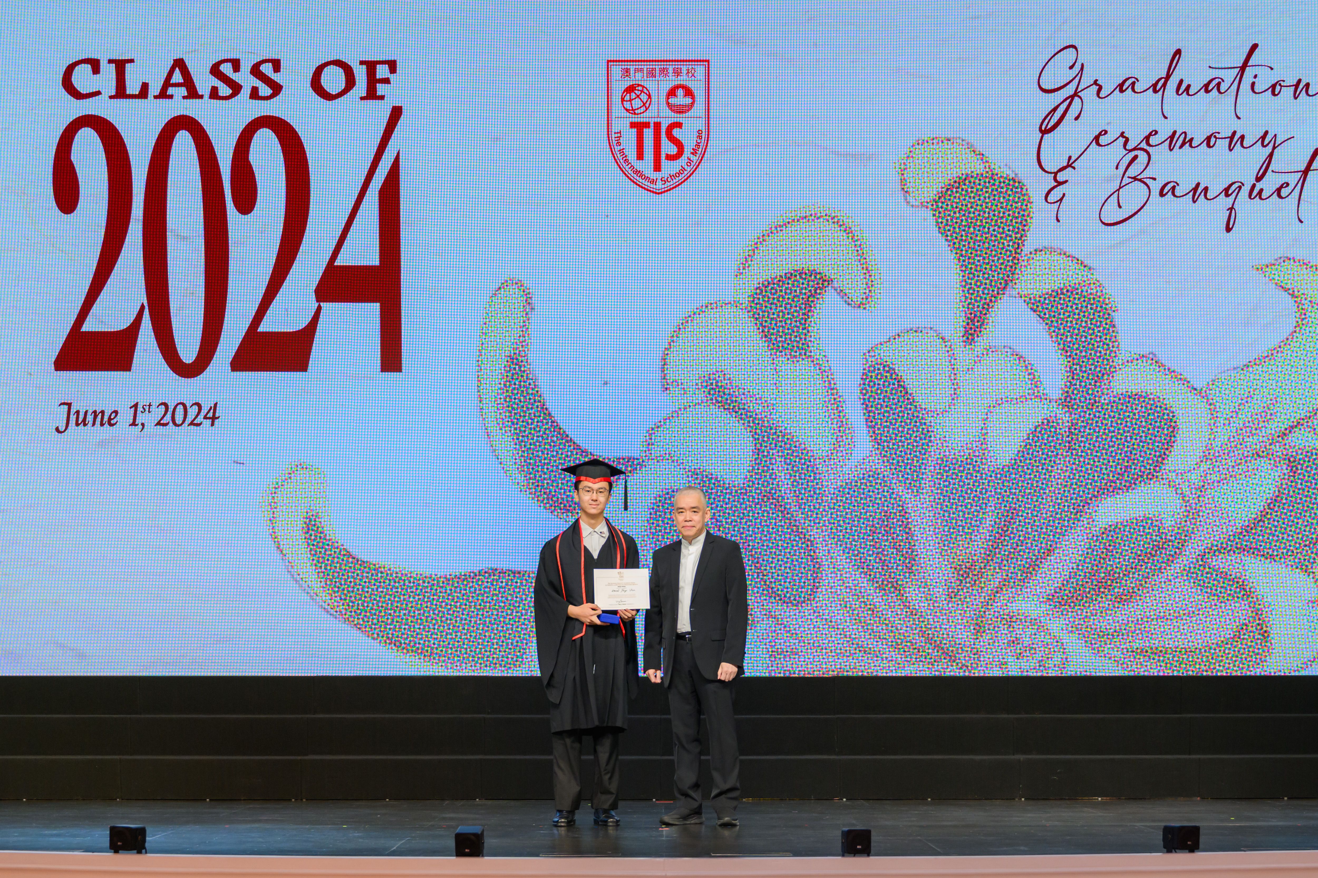 The 2024 Graduation Ceremony of The International School of Macao (TIS) was held at Wynn Palace Hotel on Saturday, June 1st, 2024. Attended by family, friends, teachers, guests, and TIS leadership, the event celebrated the graduation of 63 students. Guests included the Head of Department of Students from Education and Youth Development Bureau of Macao SAR (DSEDJ) Mr. Chan Iok Wai, the Acting Consul General of Canada in Hong Kong and Macao Mr. Jason Reeve, TIS Board of Governors Dr. KL Tong, TIS School Supervisor Dr. Howard Stribbell.