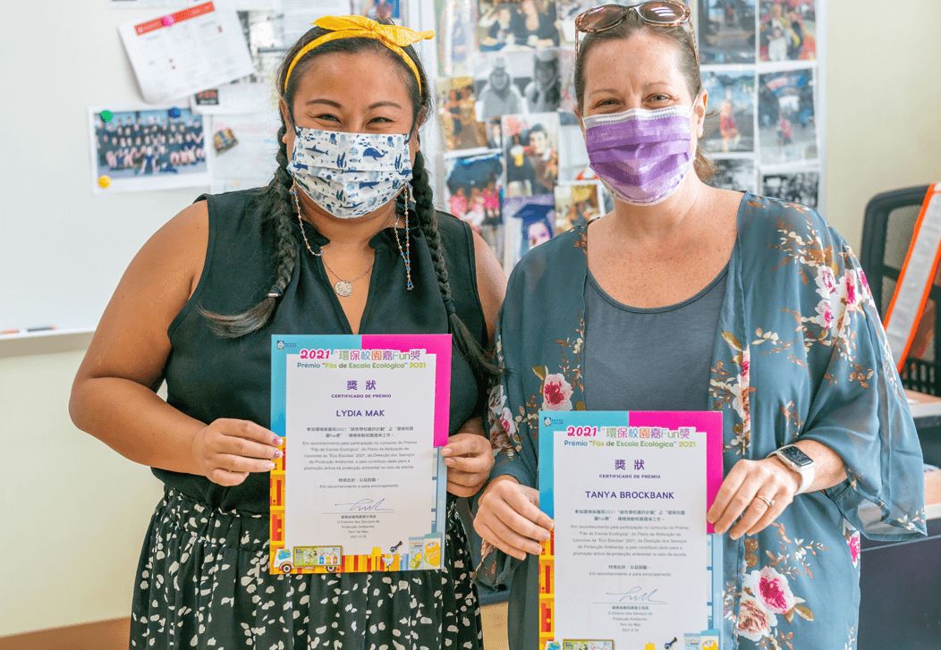 The journey to success for TIS Teachers Ms. Tanya Brockbank and Ms. Lydia Mak commenced with an inspiring book, ‘The Journey of Plastiki’. This culminated in receiving a "Fãs da Escola Ecológica" award, (Fans Of The Ecological Schools) from the Direcção dos Serviços de Protecção Ambiental for their green initiative lesson plan.