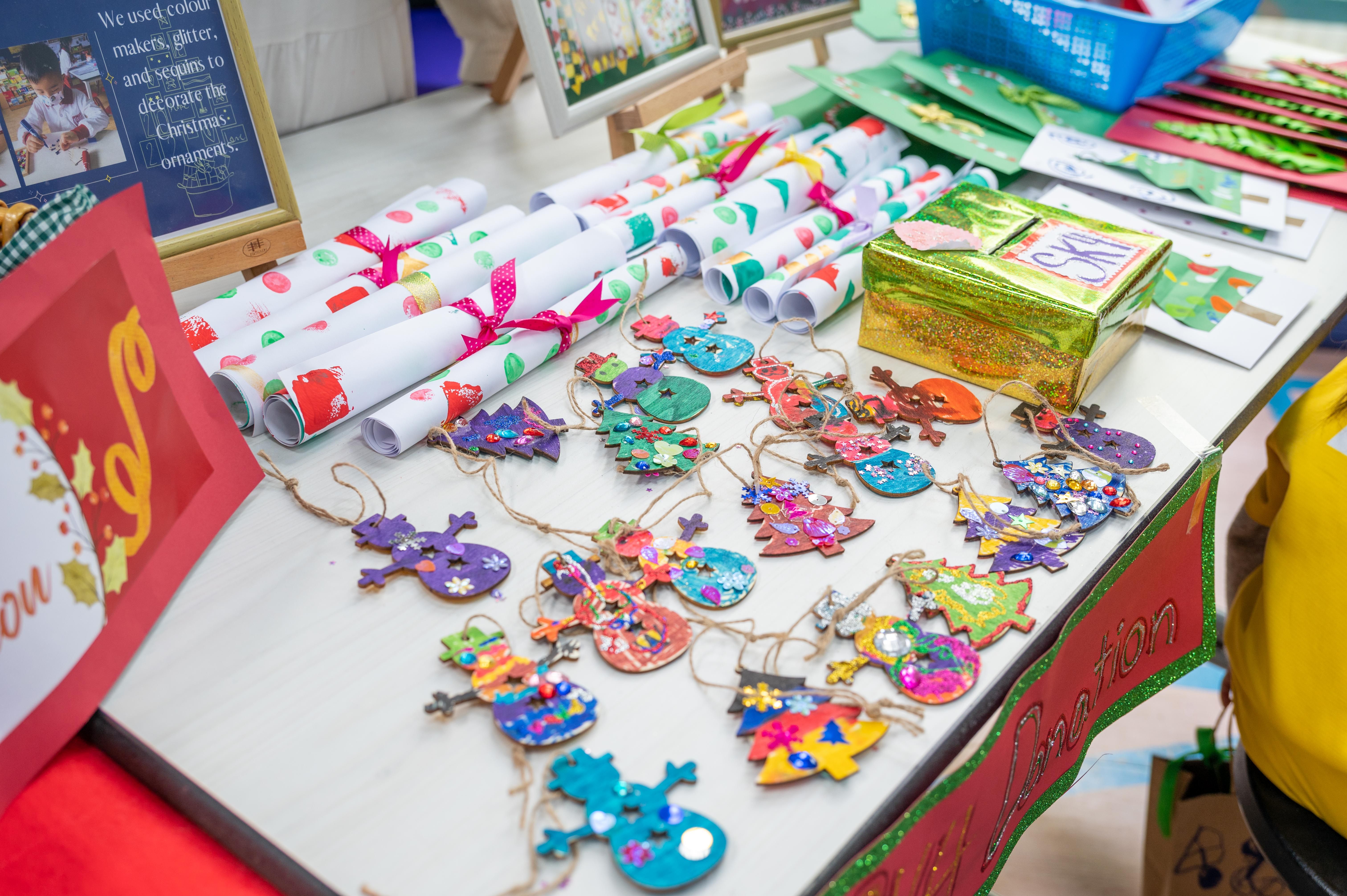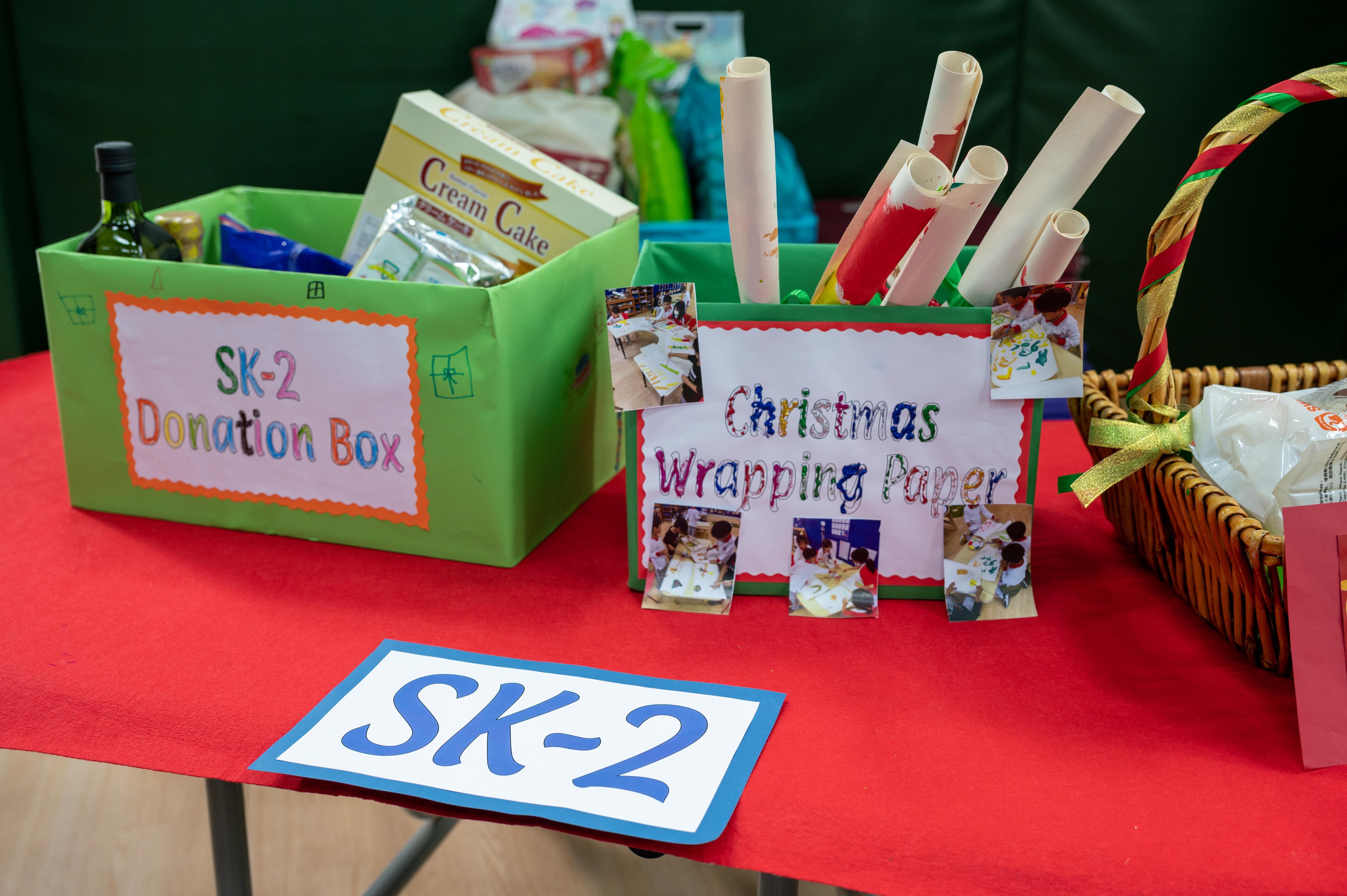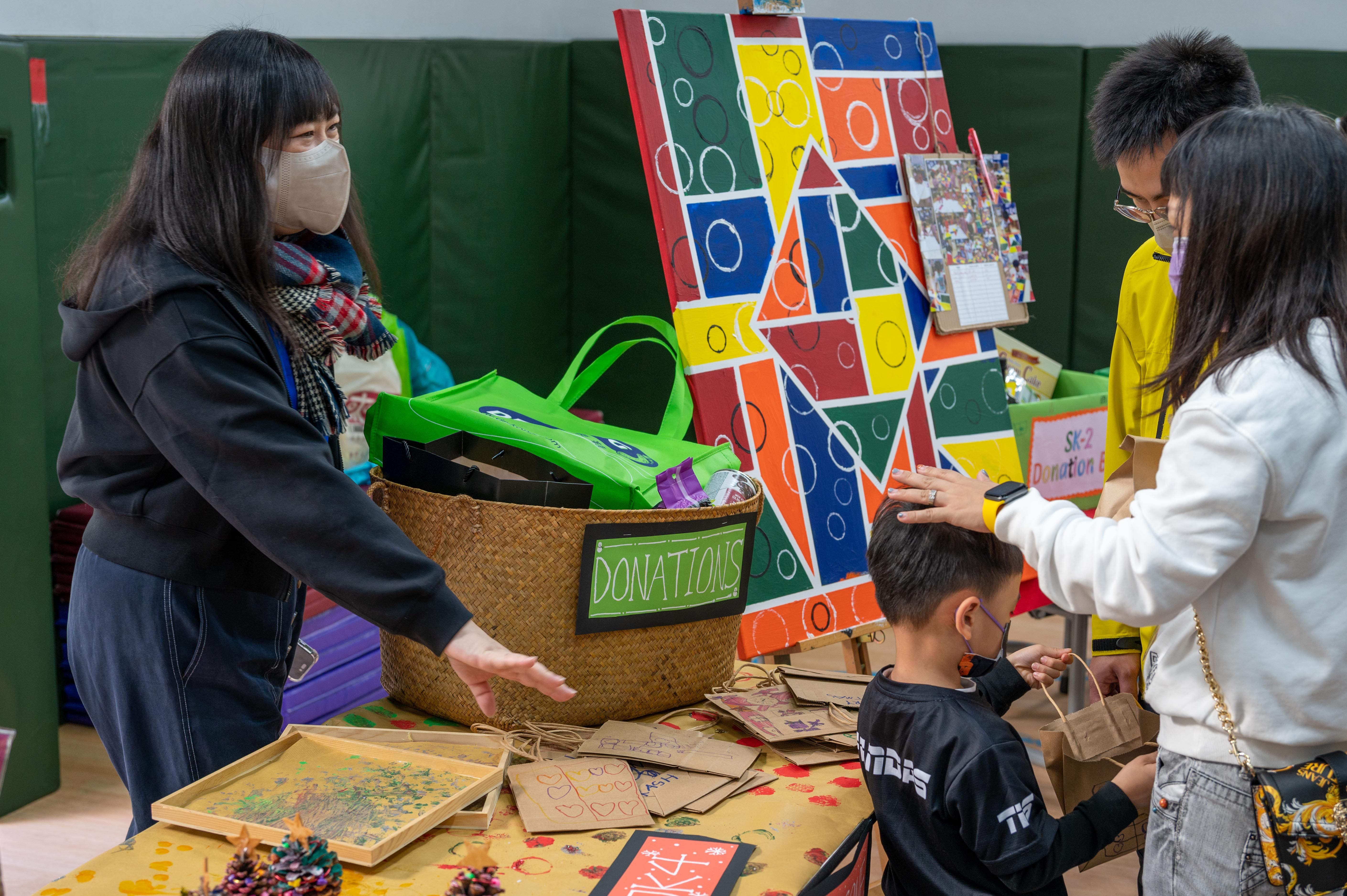This year, with the United Nations’ Sustainable Development Goals in mind of #1 No Poverty, #2 Zero Hunger, #11 Sustainable Cities and #14 Communities and Life Below Water, the Kindergarteners collected donations for Caritas and Cradle of Hope. By donating an item, you could take home a wonderful project made with recycled materials by students from Pre-K (K-1), JK (K-2) and SK (K-3). For example, inspired by their field trip to Hác Sá beach, PK-1 students found beautiful shells that they turned into unique keychains. They added beads to them, exercising their motor skills, math and language skills as they negotiated with each other to share different materials for their creations.