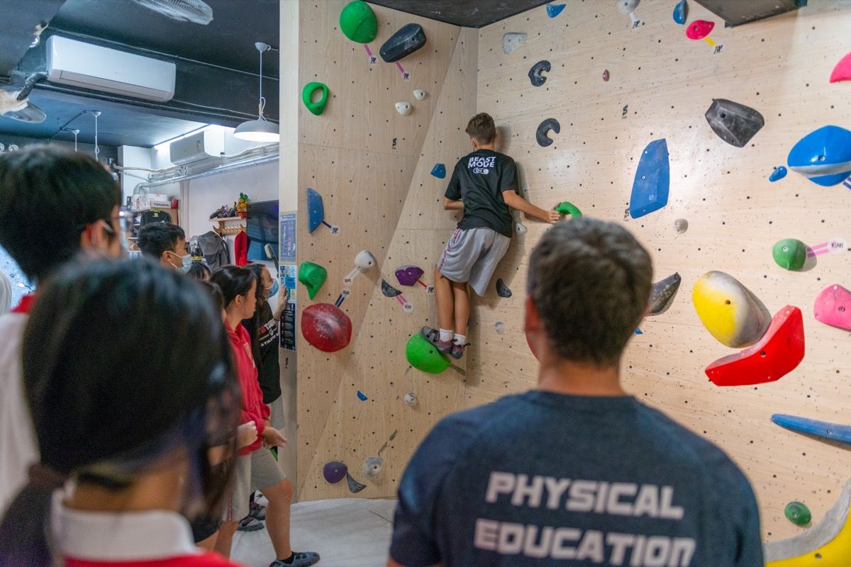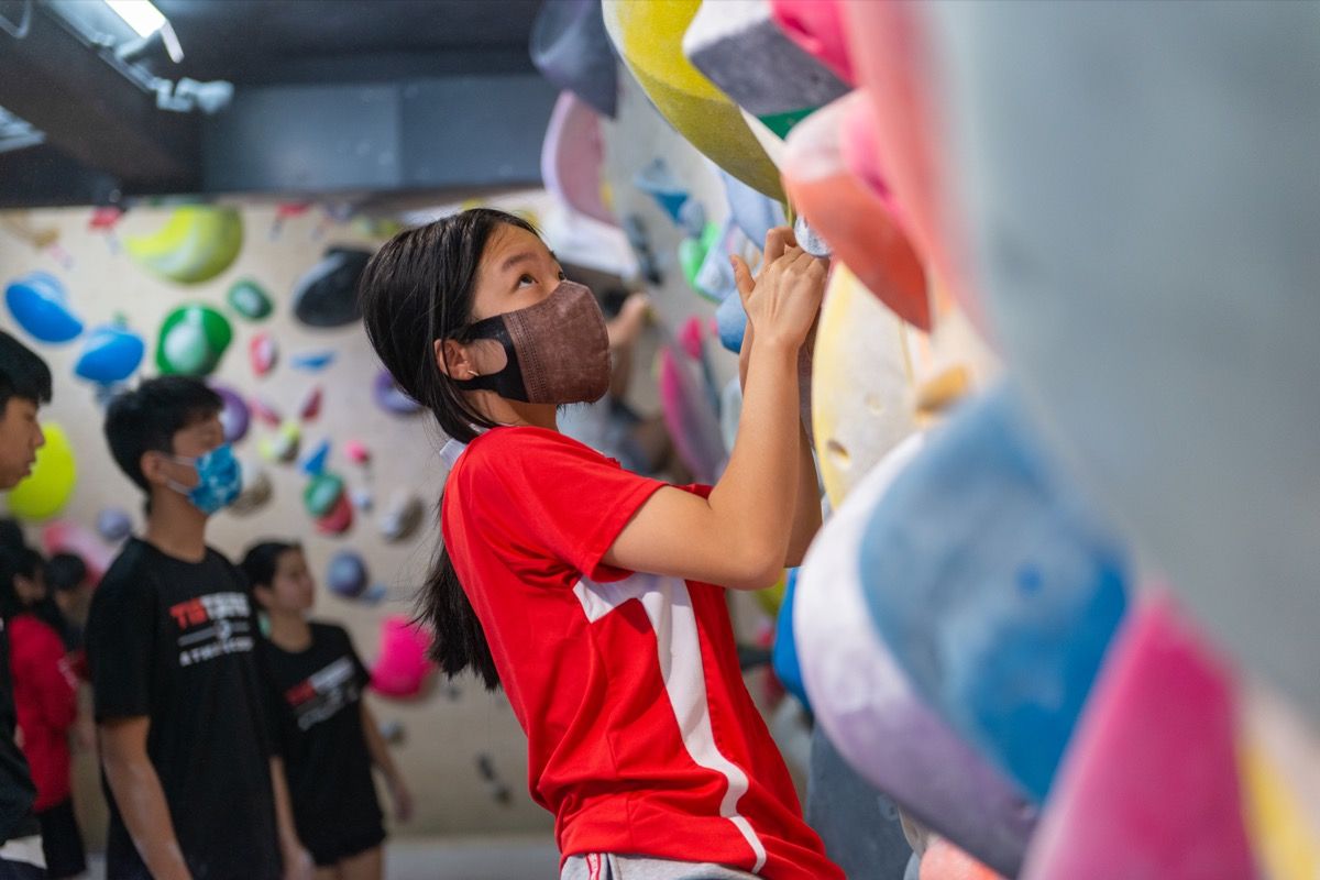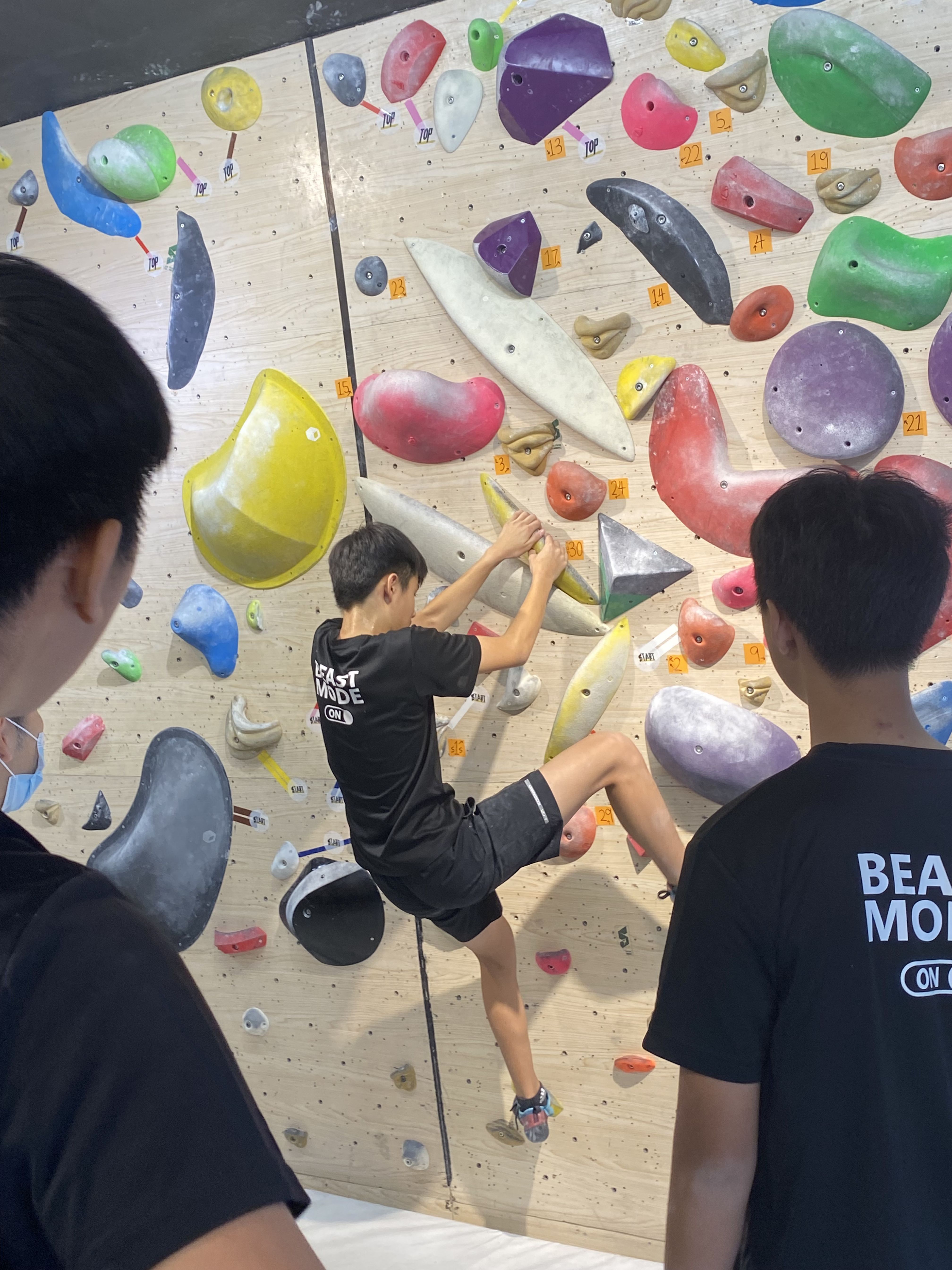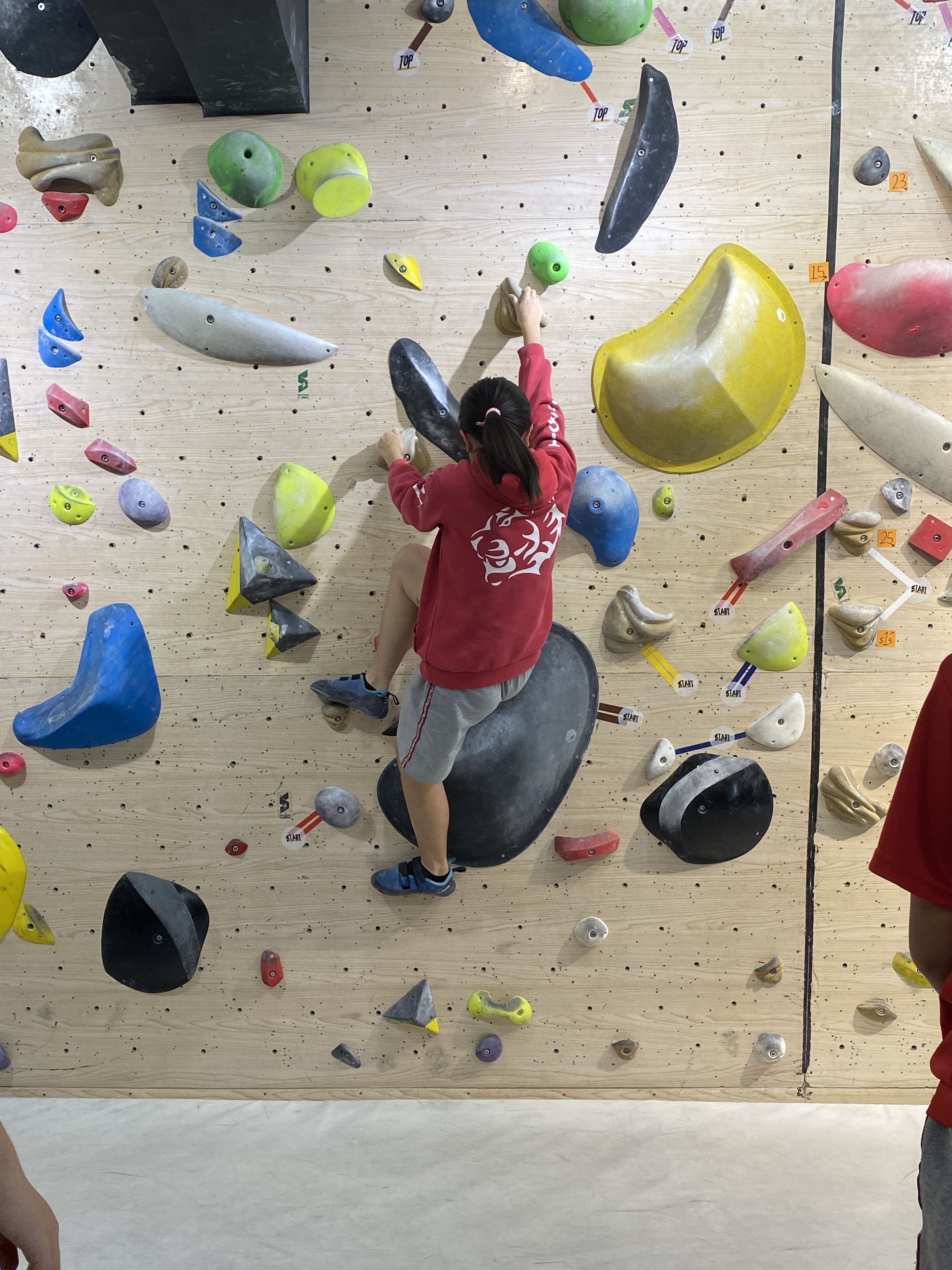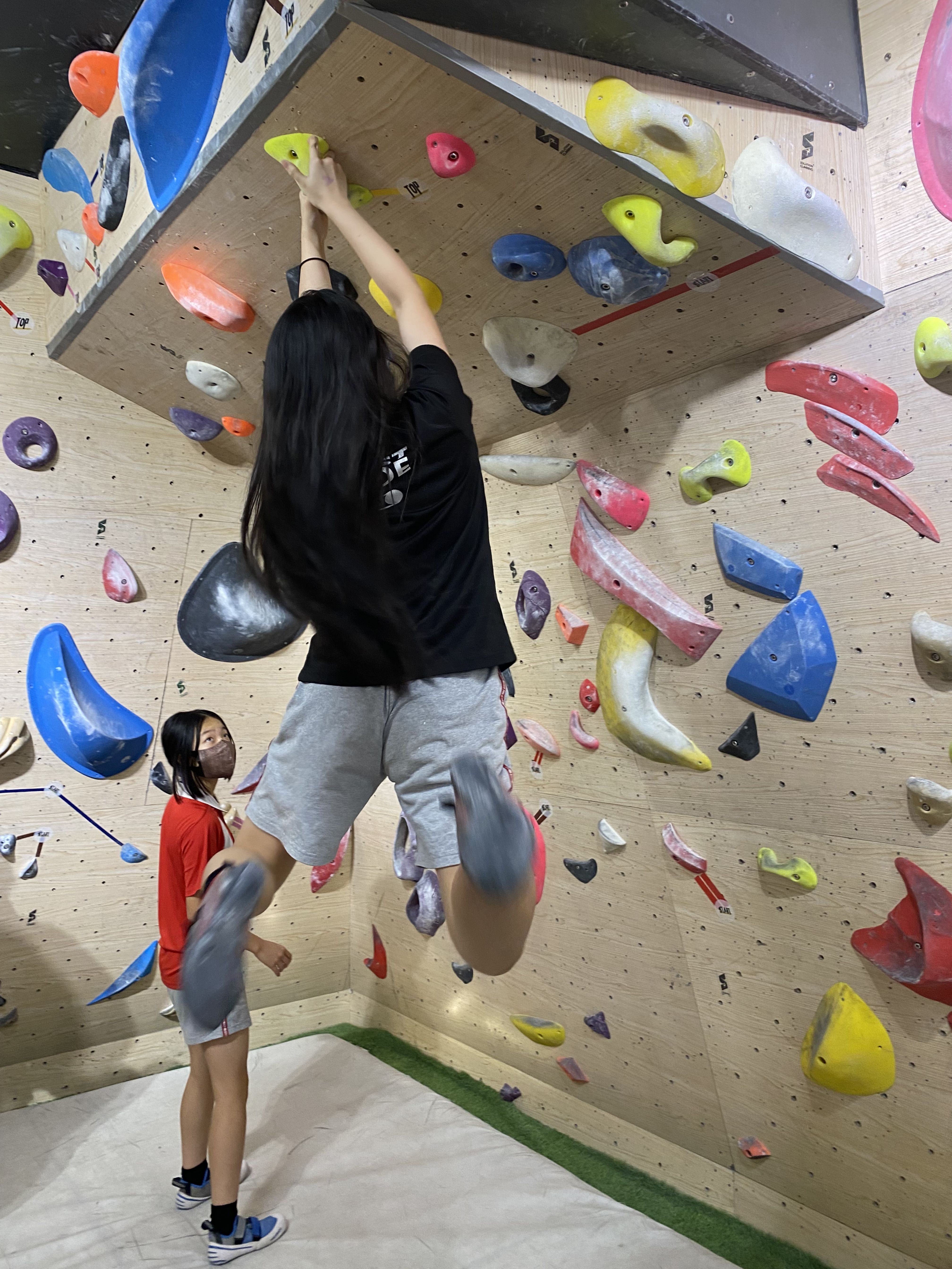 Taking on the colourful grips in front of her, Bernice takes the first steps and grabs on to the grips of the path of a V2 boulder. She quickly makes her way up and gets herself a meter off the ground in no time. She’s had some practice before: this is not the first time the grade 9 Outdoor Education students were there. But, there’s no perfect formula no matter how many times you’ve done this before and, halfway through, she realizes she needs to re-strategize. So, she stops, hanging in there, without releasing her grip while rethinking her path. She hears Mr Leguerrier’s voice from the back of her head, giving helpful instructions to lead her to a possible route. Finally, she’s “in the zone”, and a few moments later, with the strength of her legs, she pulls herself up, stretching her left hand to reach the top brown boulder and joining in her right hand. She hears Mr Leguerrier count “One...two...three!”, and that’s her cue to drop down after conquering the V2 path. Now, on to the next challenge.