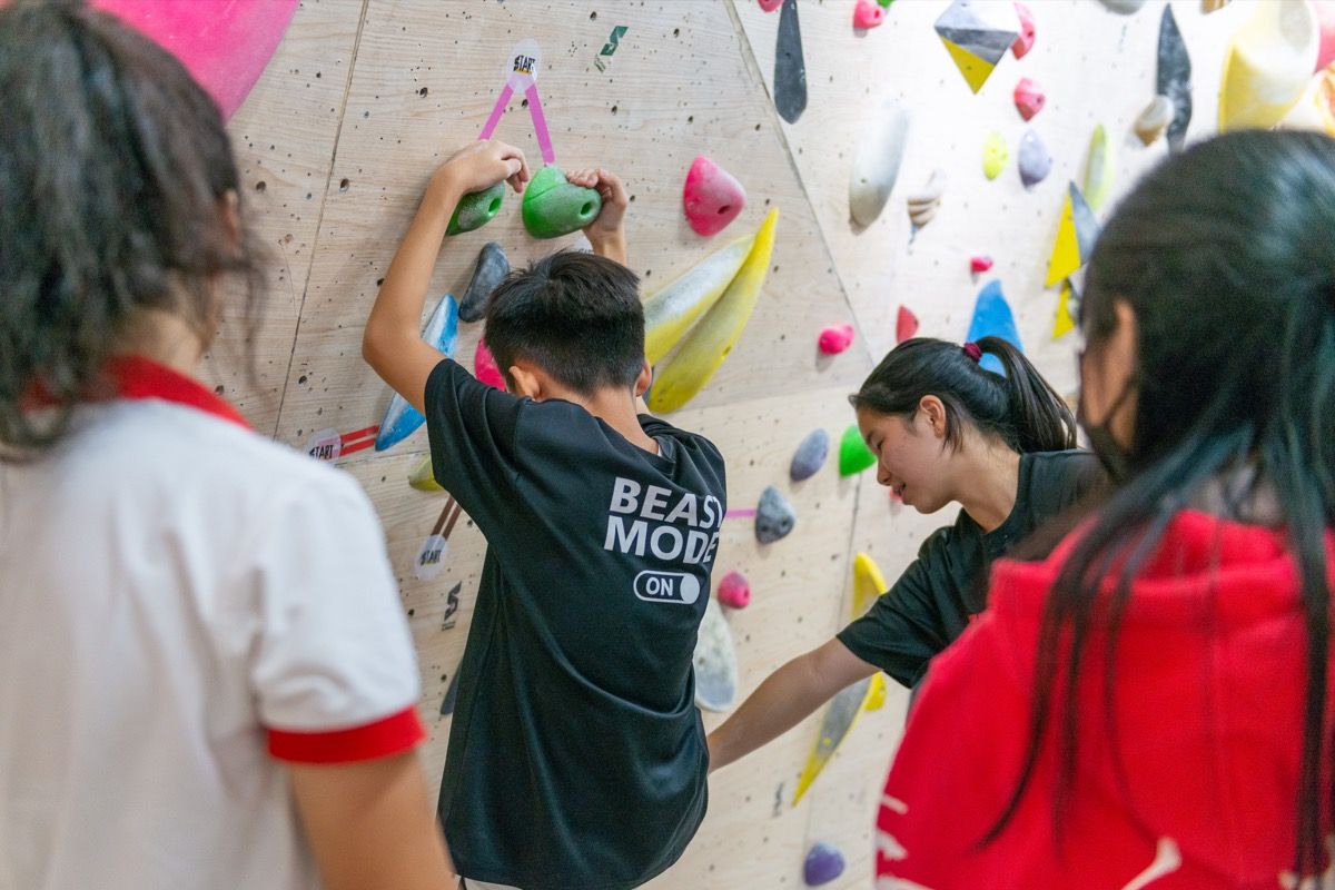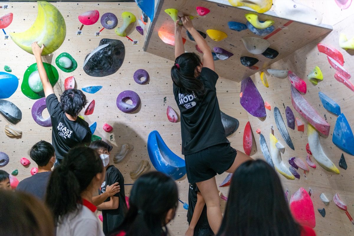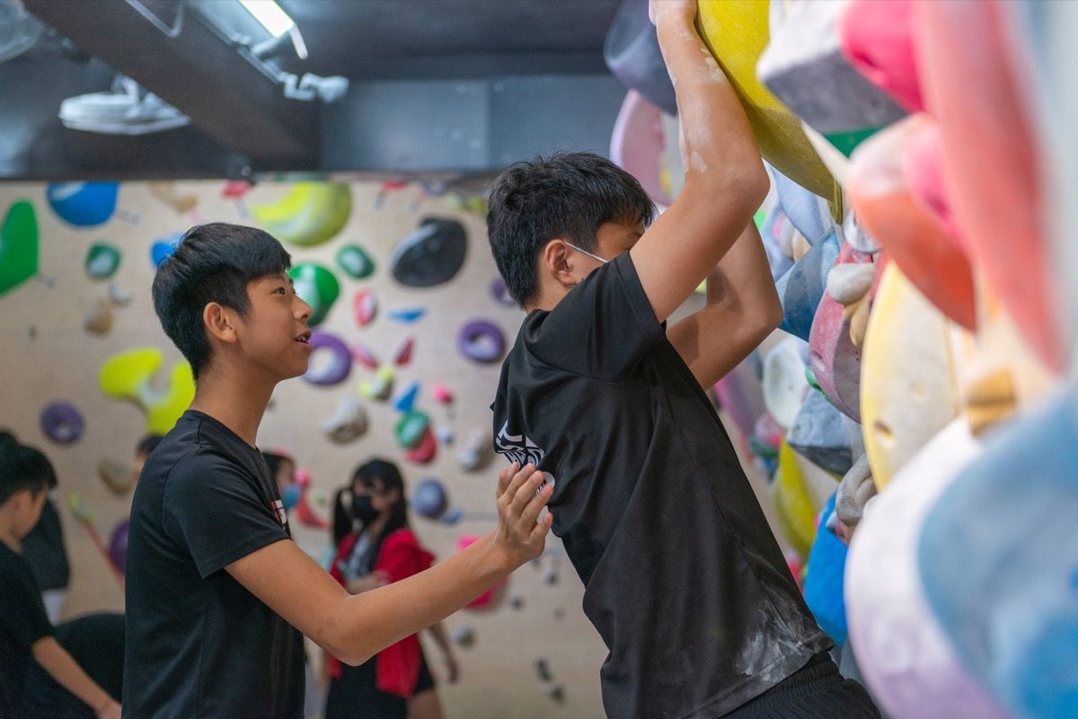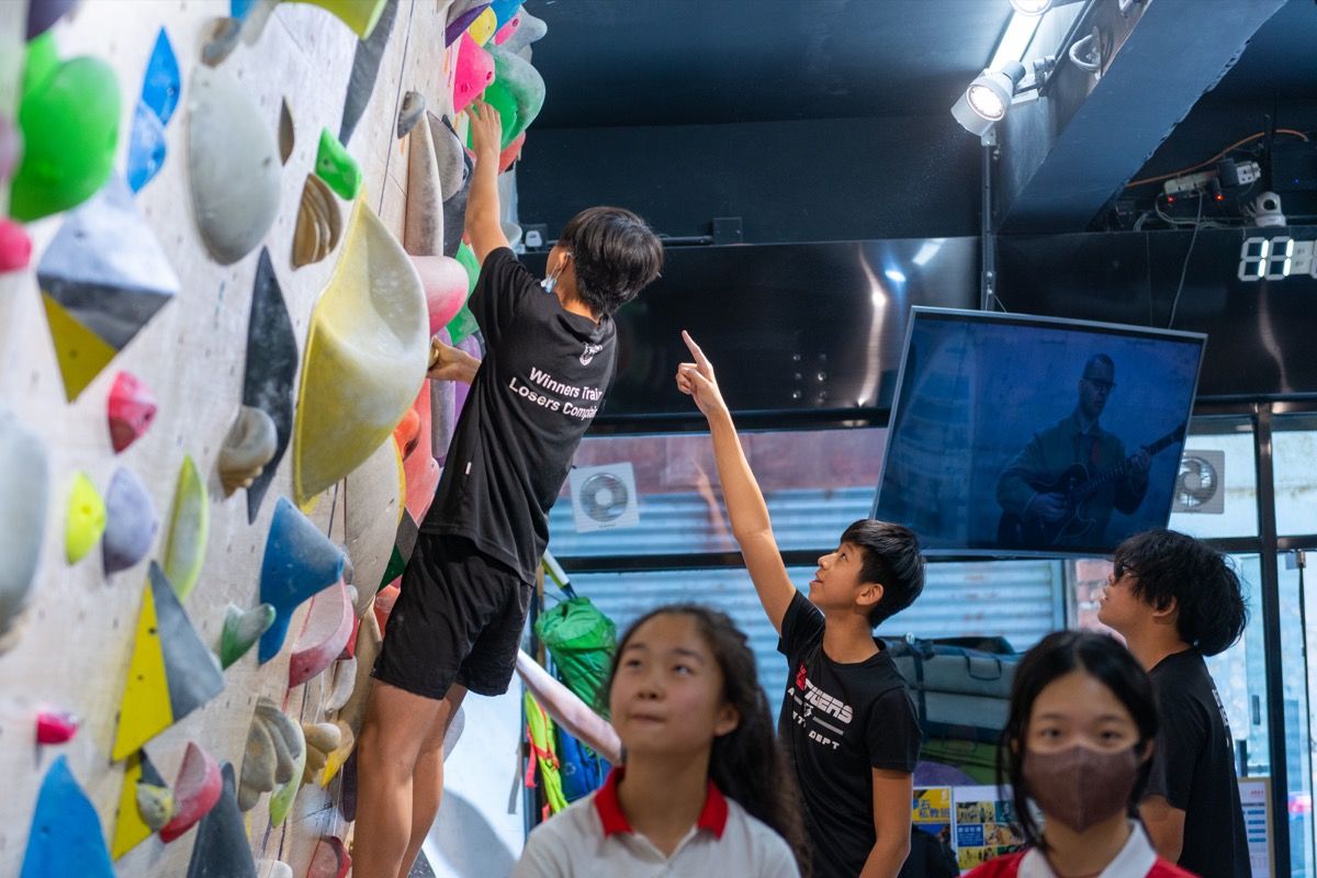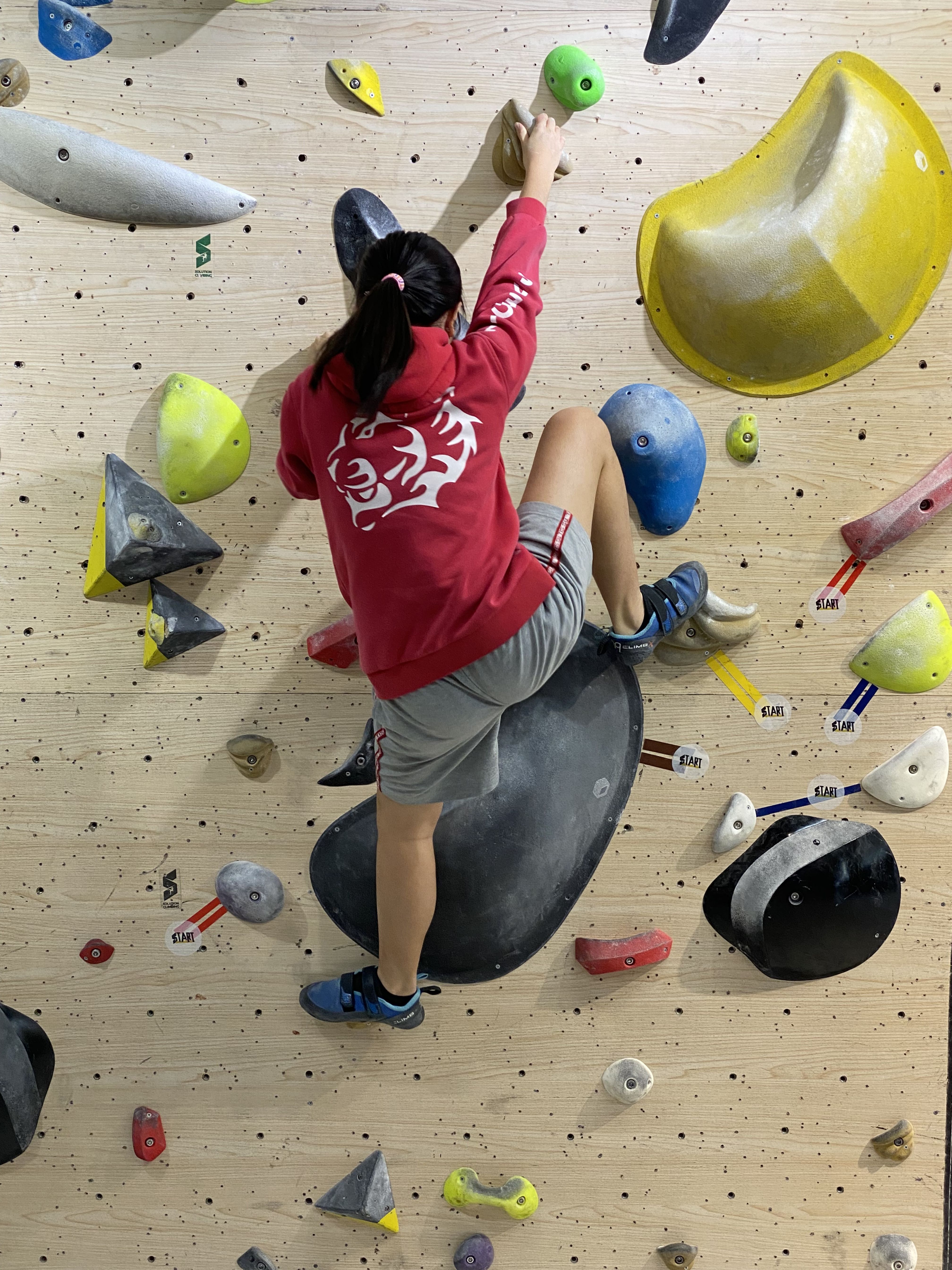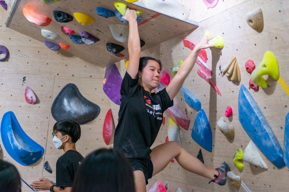Taking on the colourful grips in front of her, Bernice takes the first steps and grabs on to the grips of the path of a V2 boulder. She quickly makes her way up and gets herself a meter off the ground in no time. She’s had some practice before: this is not the first time the grade 9 Outdoor Education students were there. But, there’s no perfect formula no matter how many times you’ve done this before and, halfway through, she realizes she needs to re-strategize. So, she stops, hanging in there, without releasing her grip while rethinking her path. She hears Mr Leguerrier’s voice from the back of her head, giving helpful instructions to lead her to a possible route. Finally, she’s “in the zone”, and a few moments later, with the strength of her legs, she pulls herself up, stretching her left hand to reach the top brown boulder and joining in her right hand. She hears Mr Leguerrier count “One...two...three!”, and that’s her cue to drop down after conquering the V2 path. Now, on to the next challenge.