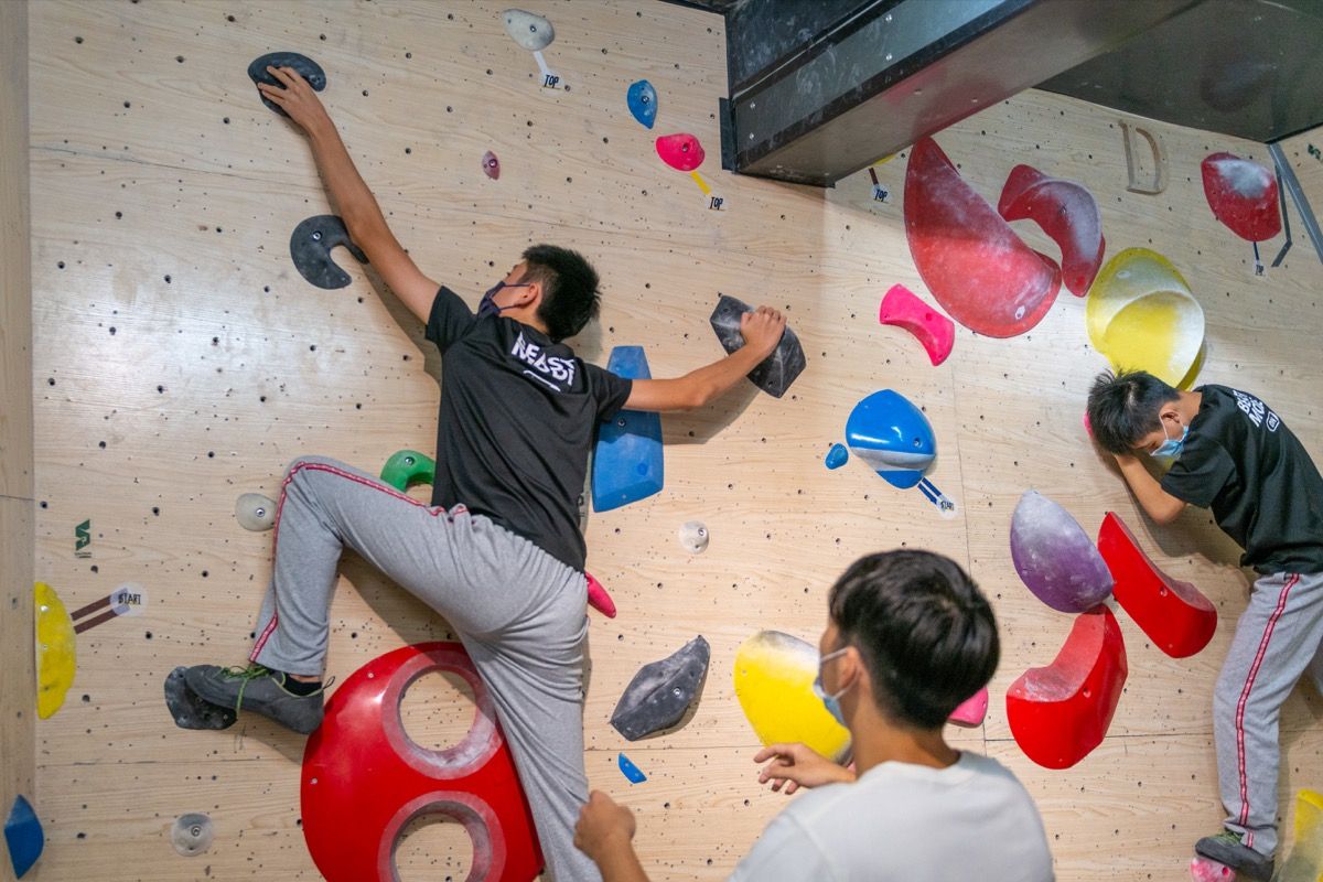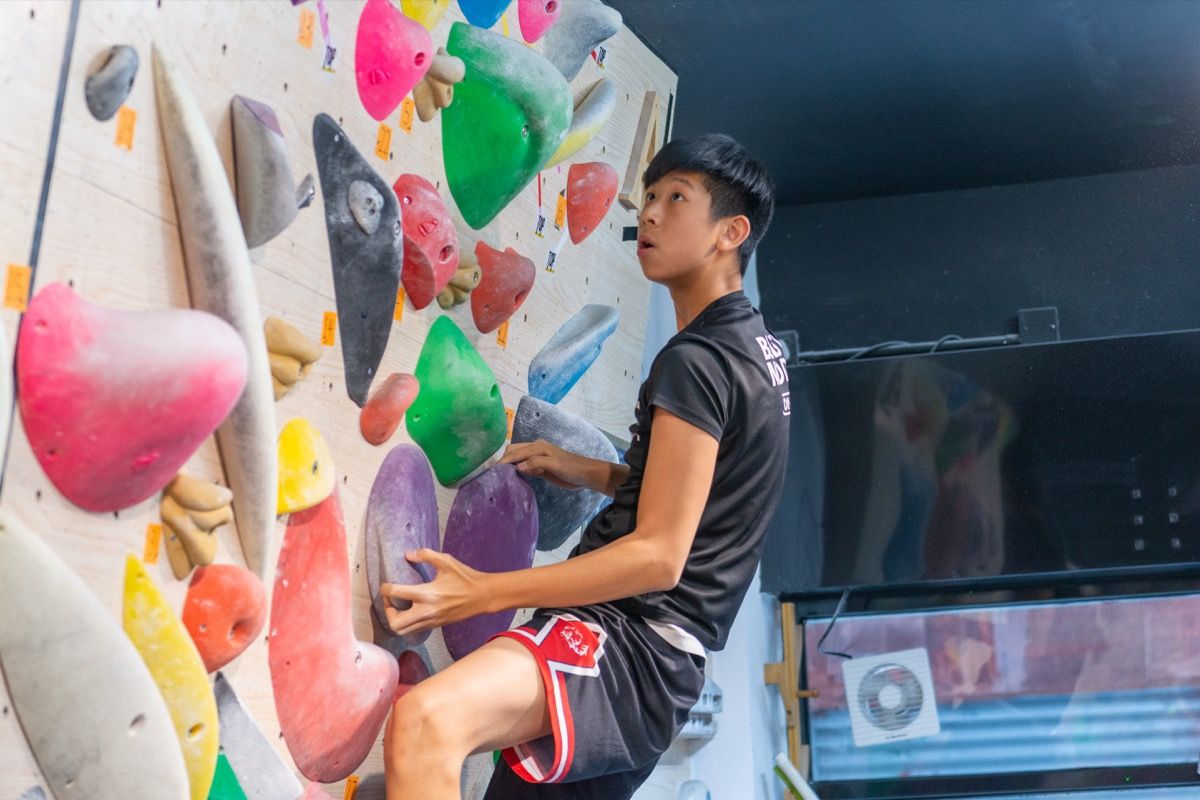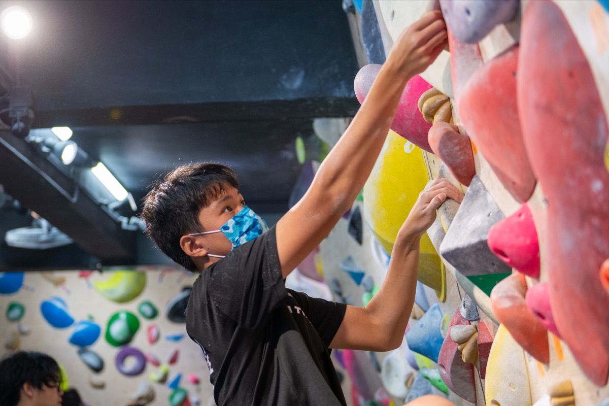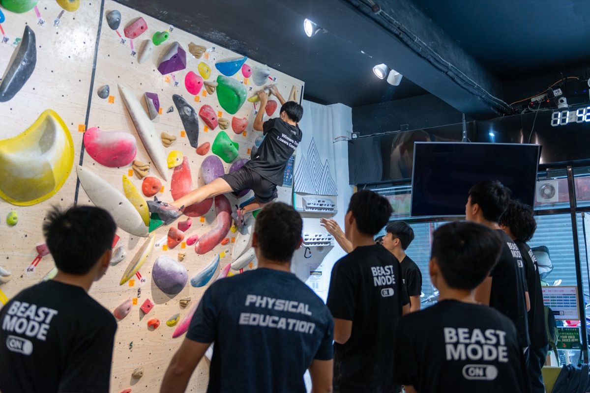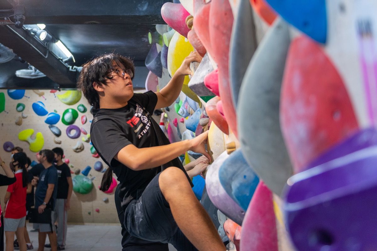 Taking on the colourful grips in front of her, Bernice takes the first steps and grabs on to the grips of the path of a V2 boulder. She quickly makes her way up and gets herself a meter off the ground in no time. She’s had some practice before: this is not the first time the grade 9 Outdoor Education students were there. But, there’s no perfect formula no matter how many times you’ve done this before and, halfway through, she realizes she needs to re-strategize. So, she stops, hanging in there, without releasing her grip while rethinking her path. She hears Mr Leguerrier’s voice from the back of her head, giving helpful instructions to lead her to a possible route. Finally, she’s “in the zone”, and a few moments later, with the strength of her legs, she pulls herself up, stretching her left hand to reach the top brown boulder and joining in her right hand. She hears Mr Leguerrier count “One...two...three!”, and that’s her cue to drop down after conquering the V2 path. Now, on to the next challenge.