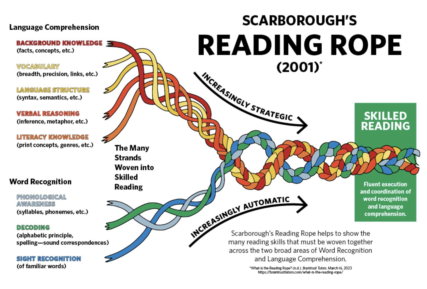 Commonly known as Scarborough's Reading Rope (2001), this model emphasizes that all aspects of language and literacy development are necessary for reading. Think of reading like a rope made of many smaller strands listed on the left side — vocabulary, structure, sounds (known as phonemes) and so much more. When all strands in the Reading Rope are in place and working together, the end result of skilled reading becomes strong. If any of the individual strands are missing, however, the Reading Rope will be impacted. This means that the reader will face challenges in achieving success in reading.