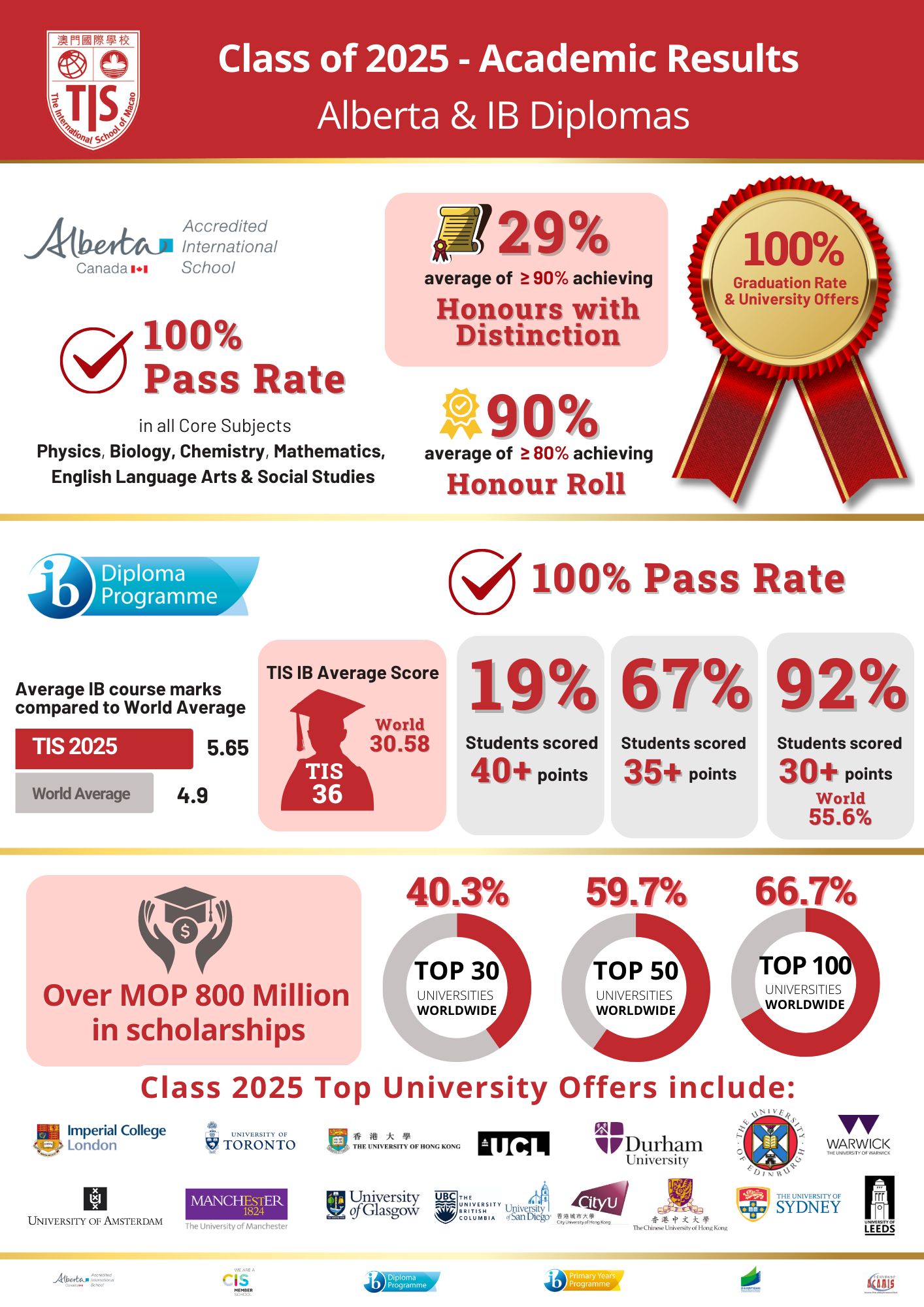 As we proudly celebrate the achievements of our graduating Class of 2025, we reflect on the dedication and resilience that have defined their journey thus far. As the sole providers of the Alberta Curriculum and the International Baccalaureate (IB) diploma programs in Macao, our students have navigated the challenges posed by rigorous international academic standards. Their outstanding results not only highlight their commitment but also position them as standout candidates for prestigious universities around the globe.