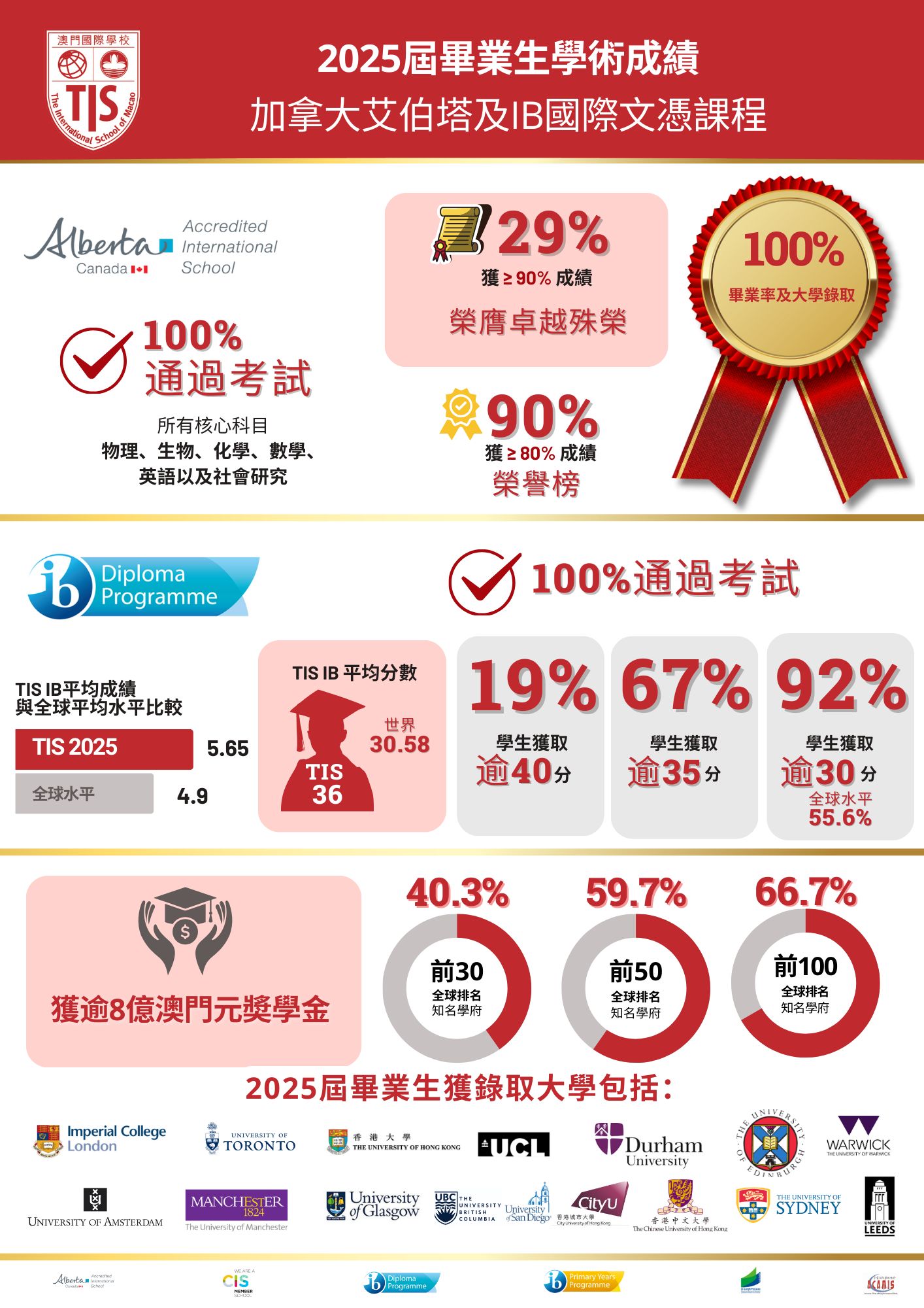 作為澳門唯一一所提供加拿大艾伯塔IB國際文憑雙軌課程的學校,㸻門滿懷自豪地見證2025屆畢業生以非凡的毅力徵服全球頂尖學術標準。他們皂卓越成就不僅彰顯治學精神,更使其成為世界名校競相爭奪的精英之才!