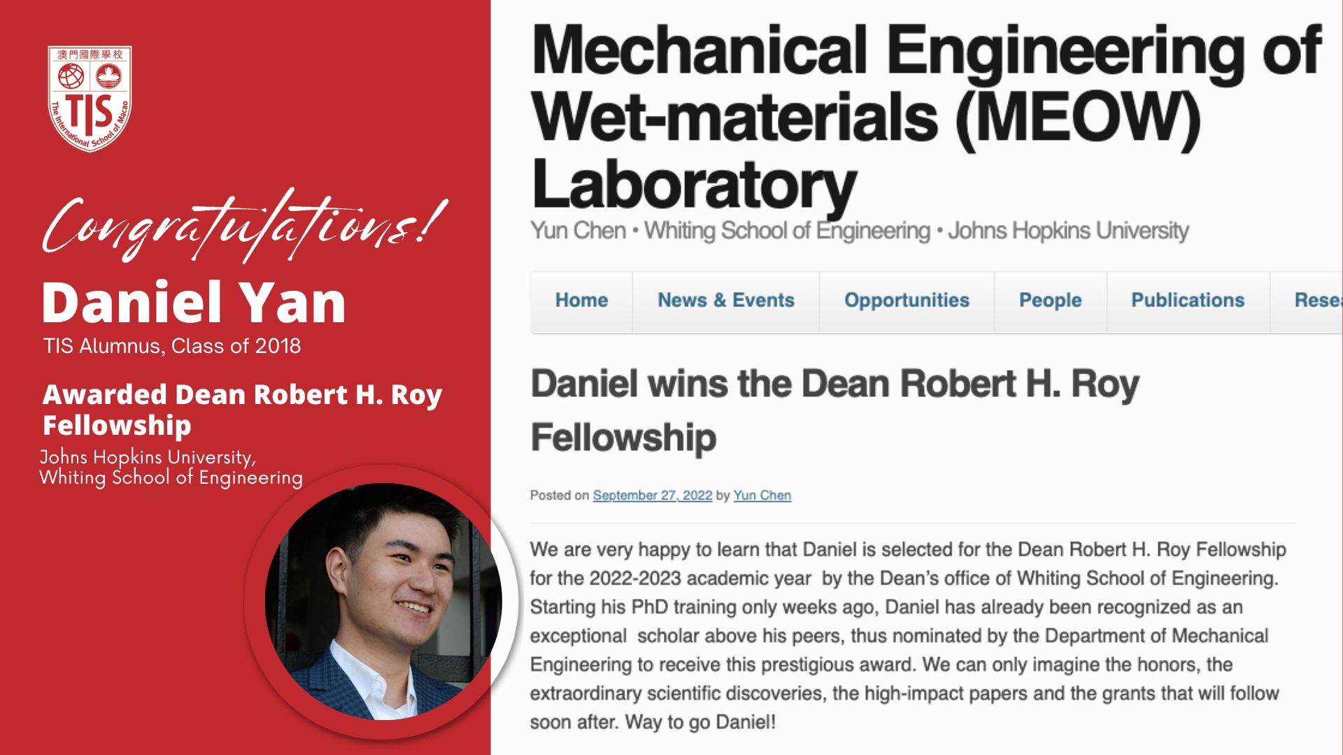 Here at TIS, we know Daniel is an exceptional student, which is why he was selected as one of the first TIS Alumni Awards for Academic Excellence! It didn't take Johns Hopkins University long to realize this either. As a result, he has now received the prestigious Dean Robert H. Roy Fellowship. This fellowship allows Daniel to focus on furthering his passion for science. We can hardly wait to hear about what incredible new scientific discoveries he will bring to light.