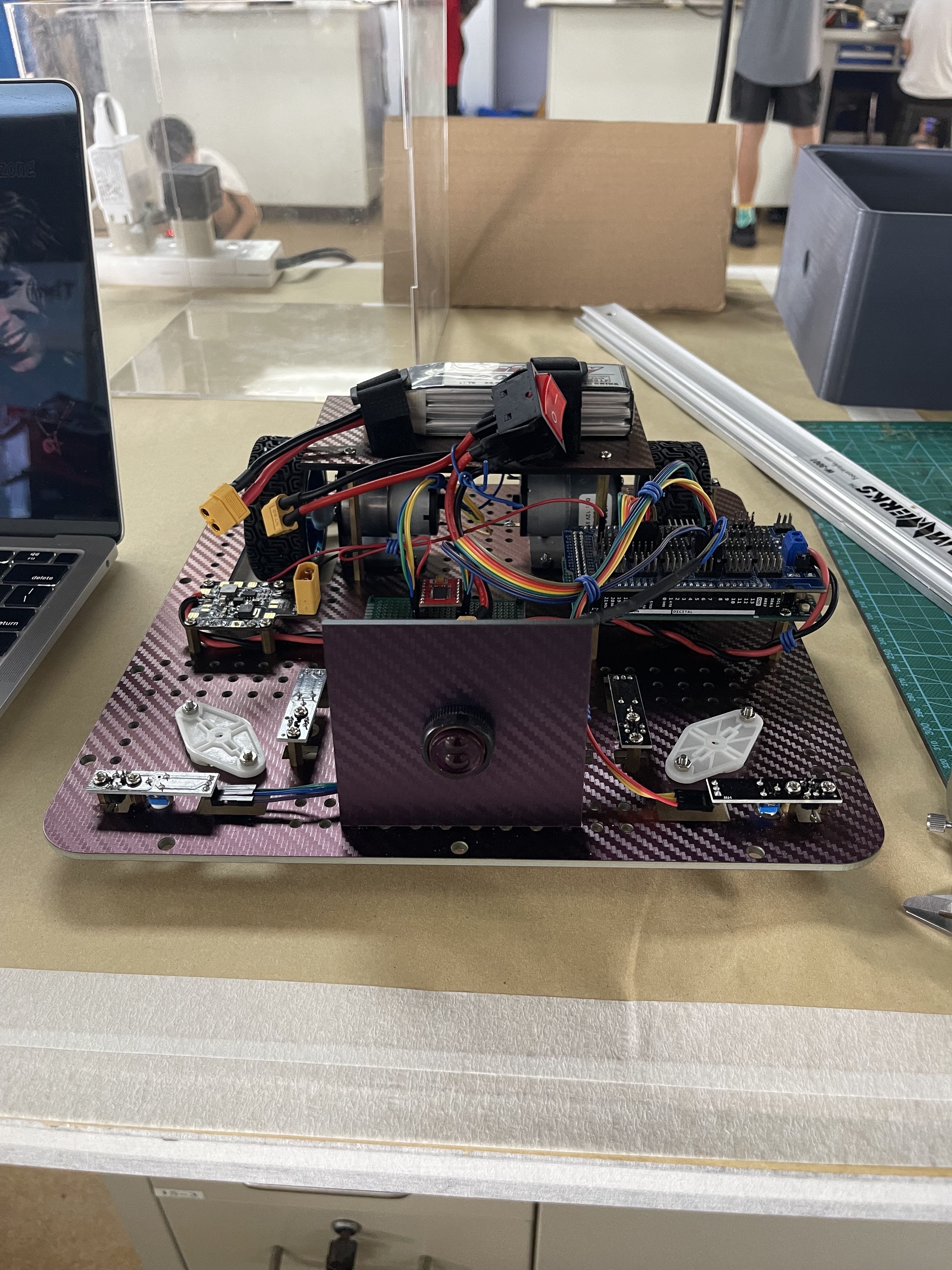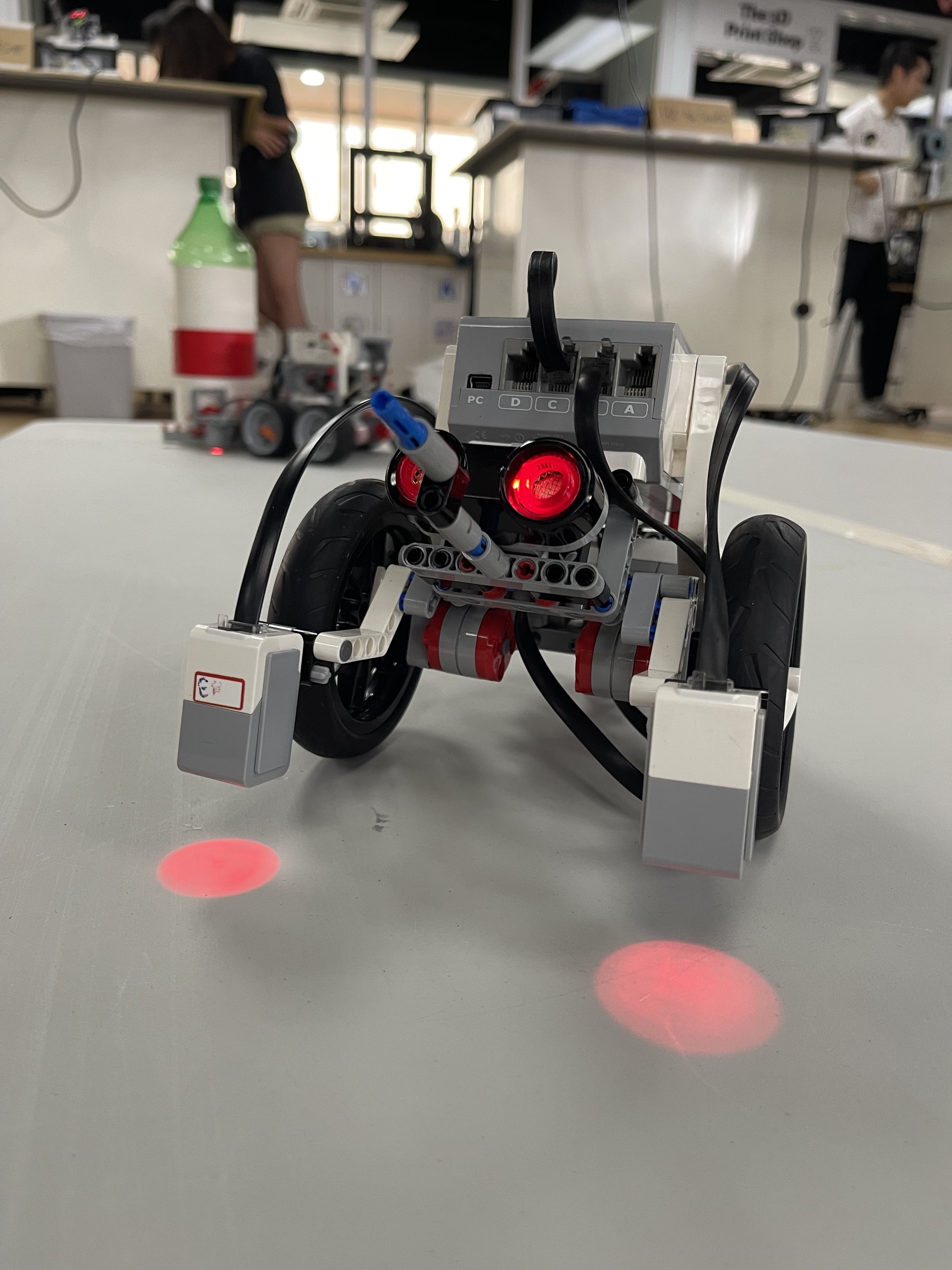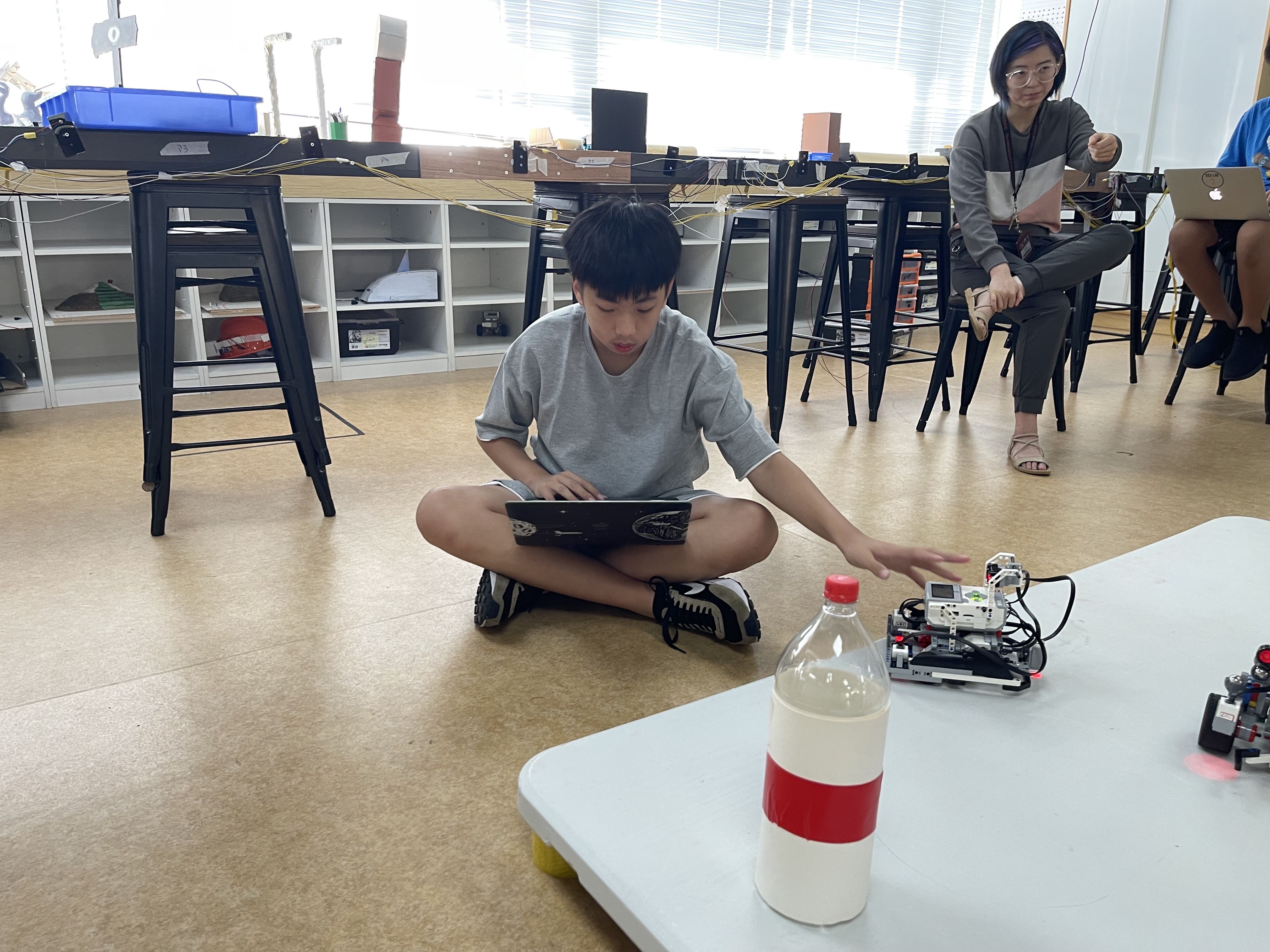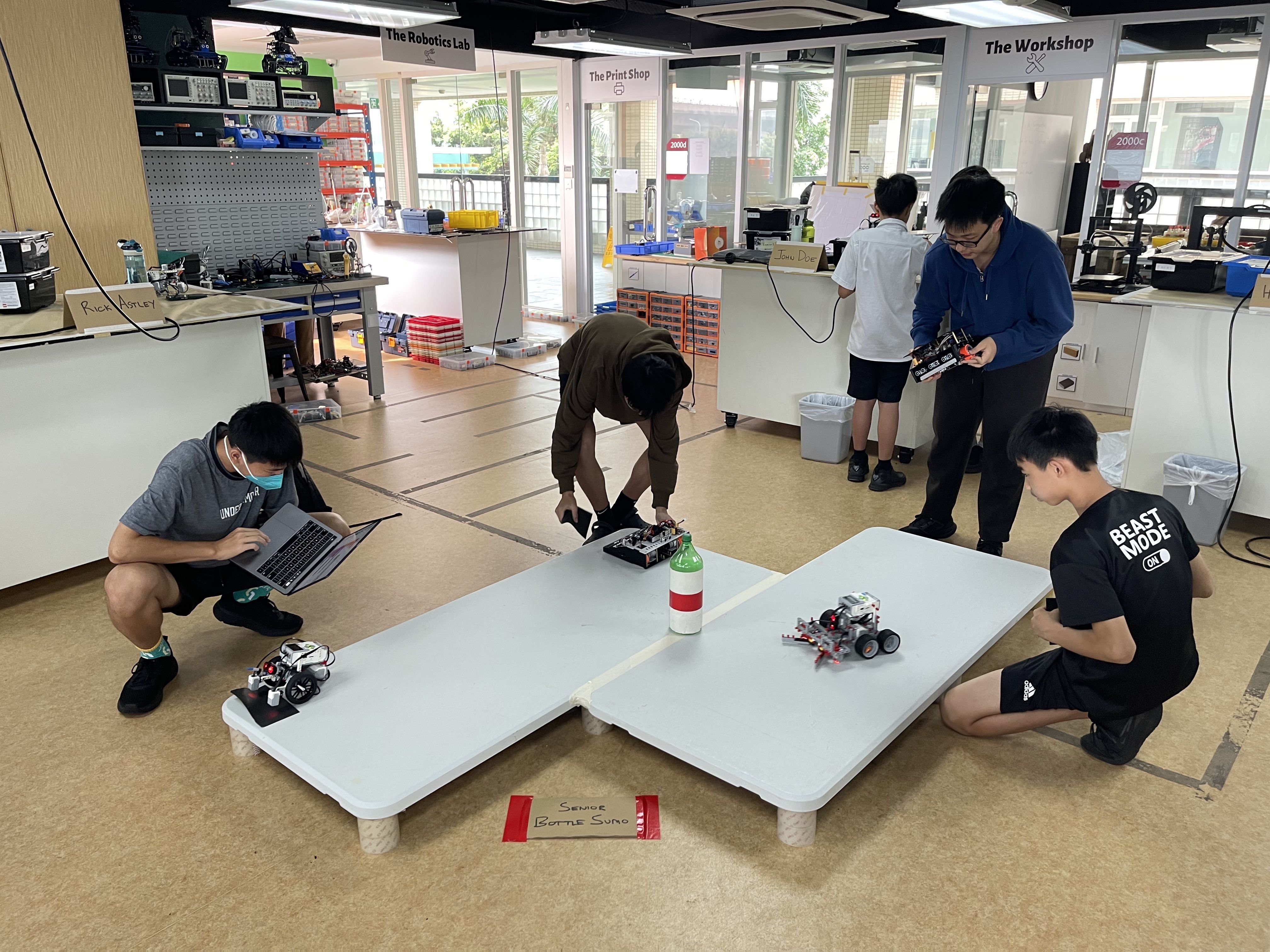 During the Robotics Competition, students showed off their skills in a variety of events, including "Bottle Sumo" where robots aimed to be the first to push a two-liter bottle off the table or be the last robot remaining against their opponents, and the "Unknown Mission Challenge" where robots were built and programmed on site for an unknown mission that was only revealed during the competition.