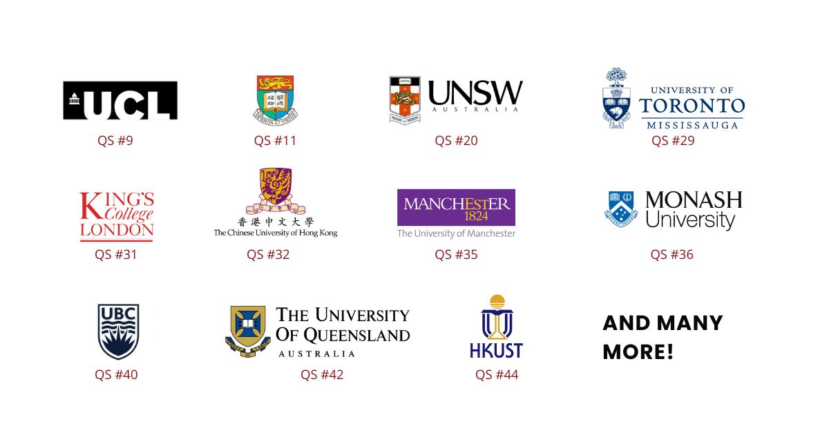 Join us for the most anticipated event of the year! This year’s University Fair welcomes over 110 representatives from top universities across Asia, Europe, North America, and beyond! Including 11 universities from QS Top 50: