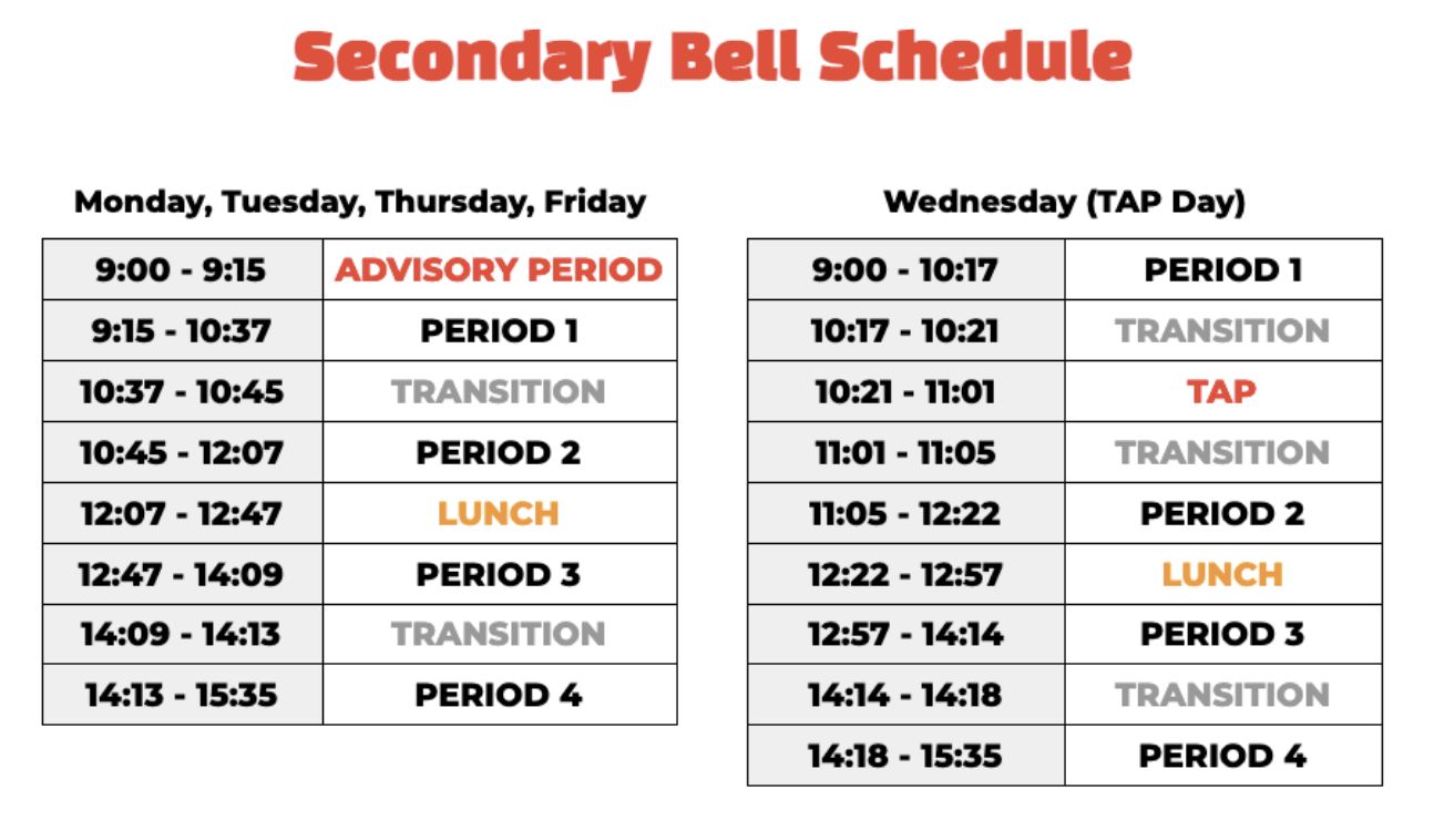 Some of the most obvious changes as a student moves from grade 6 to grade 7 are new teachers, longer periods, different schedules and classes, and increased workload. Students will move from classroom to classroom in Middle School but they will still have a TAP (Teacher Advisor Program) advisor who will be their “go to” person when they have an issue. These teachers will also deliver a weekly lesson on important, relevant topics in our students’ lives. We have actually just purchased a new curriculum for TAP called the Positive Education Enhanced Curriculum that focuses on wellbeing and we believe will be a great asset to our students and teachers.The TAP schedule runs on a Wednesday which means Wednesdays look slightly different to the rest of the week (see the schedule below)
