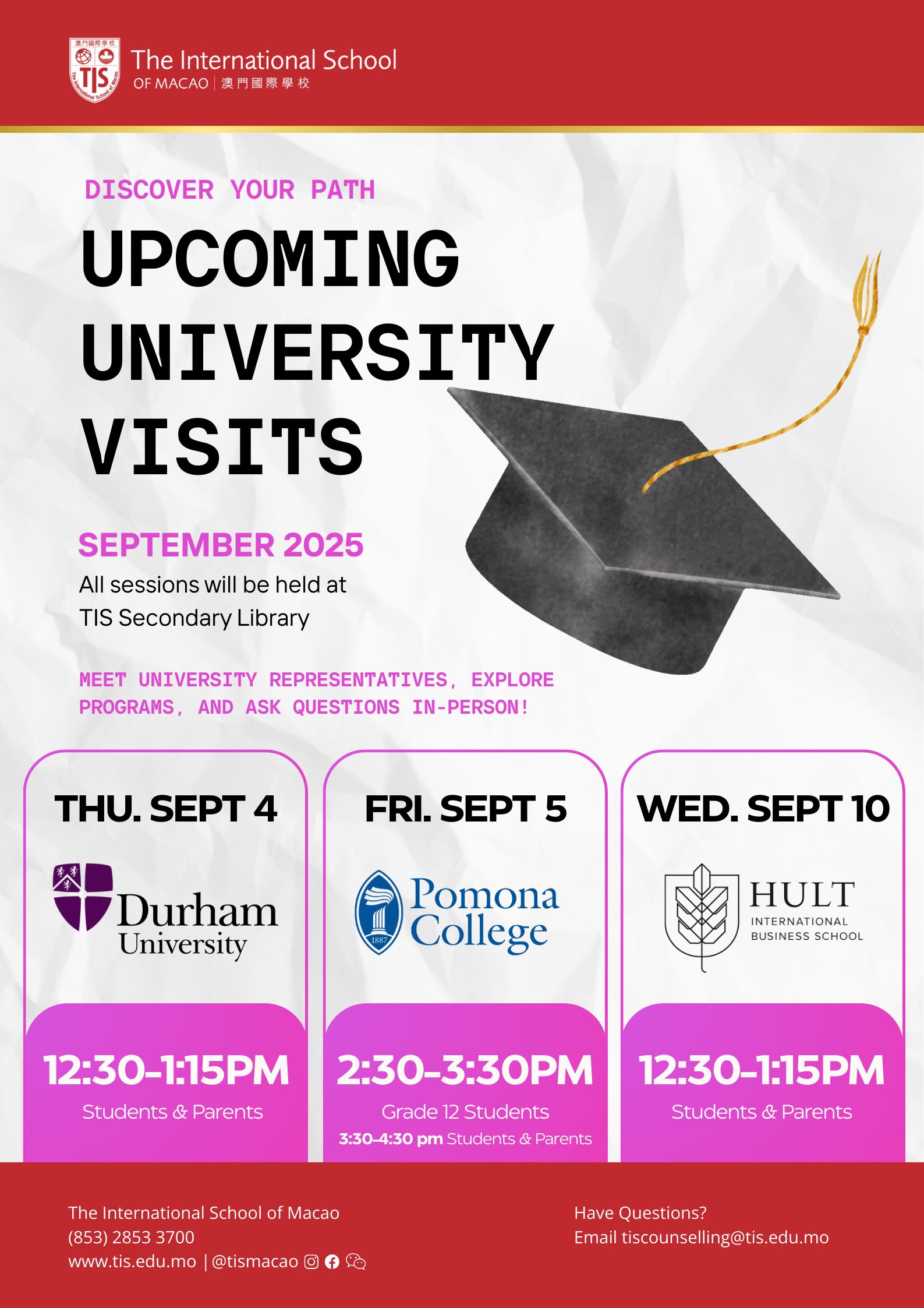 As part of our ongoing commitment to academic guidance and global pathways, our Academic Counsellors host university visits each year to support students and families in exploring post-secondary options. These sessions offer valuable insight into programs, admissions, and campus life, and serve as a lead-up to our larger TIS University Fair, happening this September 25.