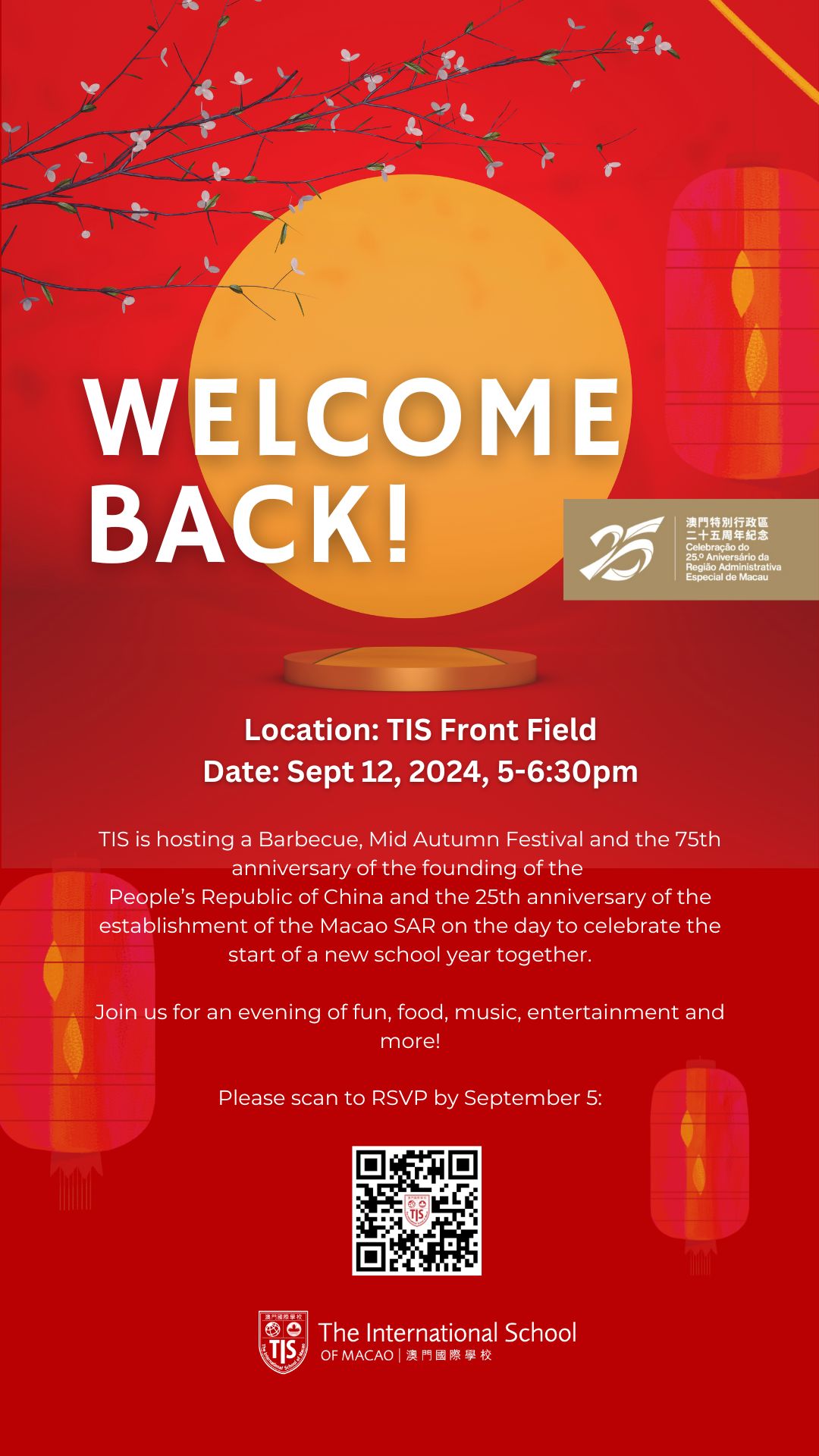 We are excited to be hosting our annual Welcome Back BBQ to start off the school year and connect with our returning and new TIS families. This year is an extra special event, as we celebrate not only the Mid-Autumn Festival, but also the 75th anniversary of the founding of the People’s Republic of China, and the 25th anniversary of the establishment of the Macao SAR!